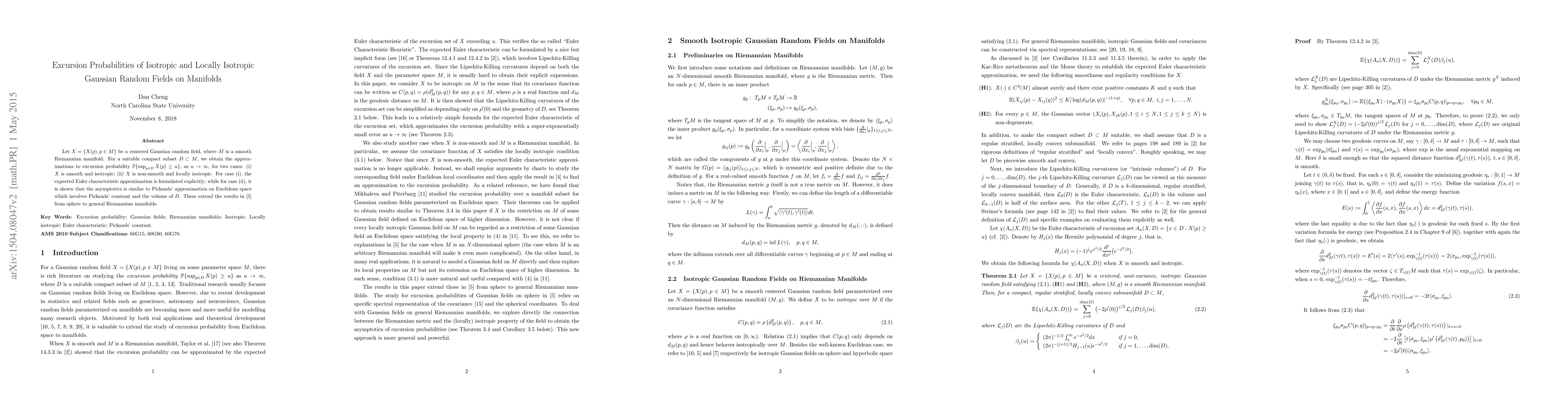 This paper studies the excursion probabilities of Gaussian random fields on smooth Riemannian manifolds, providing approximations for isotropic and locally isotropic cases as the threshold approaches infinity. For smooth and isotropic fields, an explicit Euler characteristic approximation is derived, while for non-smooth locally isotropic fields, the asymptotic behavior mirrors Pickands' approximation on Euclidean space.