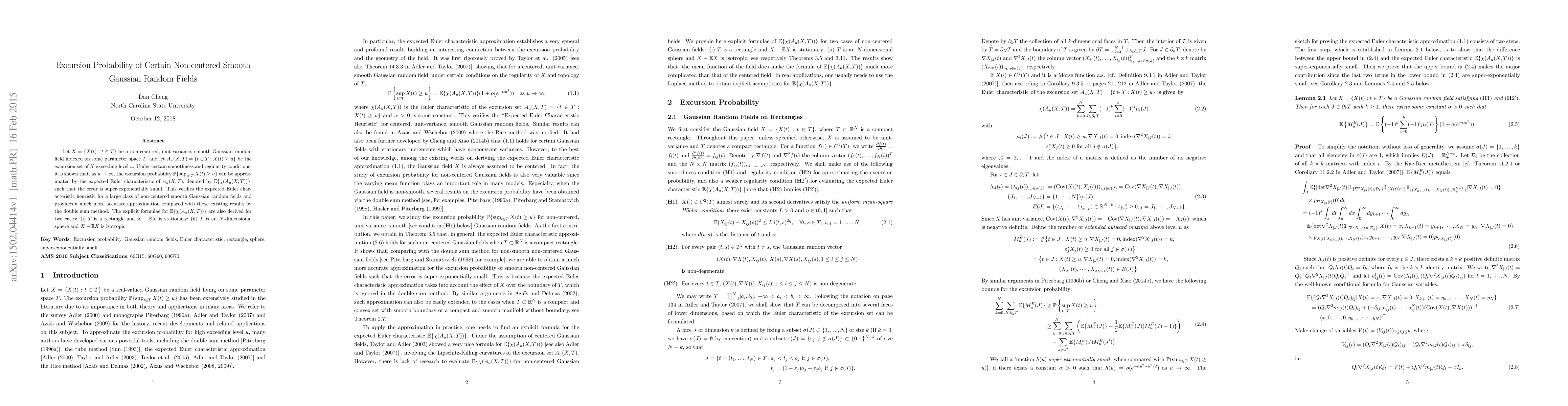 This paper investigates the approximation of the excursion probability for non-centered smooth Gaussian random fields, showing that it can be closely estimated by the expected Euler characteristic of the excursion set, with super-exponentially small error. Explicit formulae for this approximation are derived for rectangular and spherical parameter spaces.