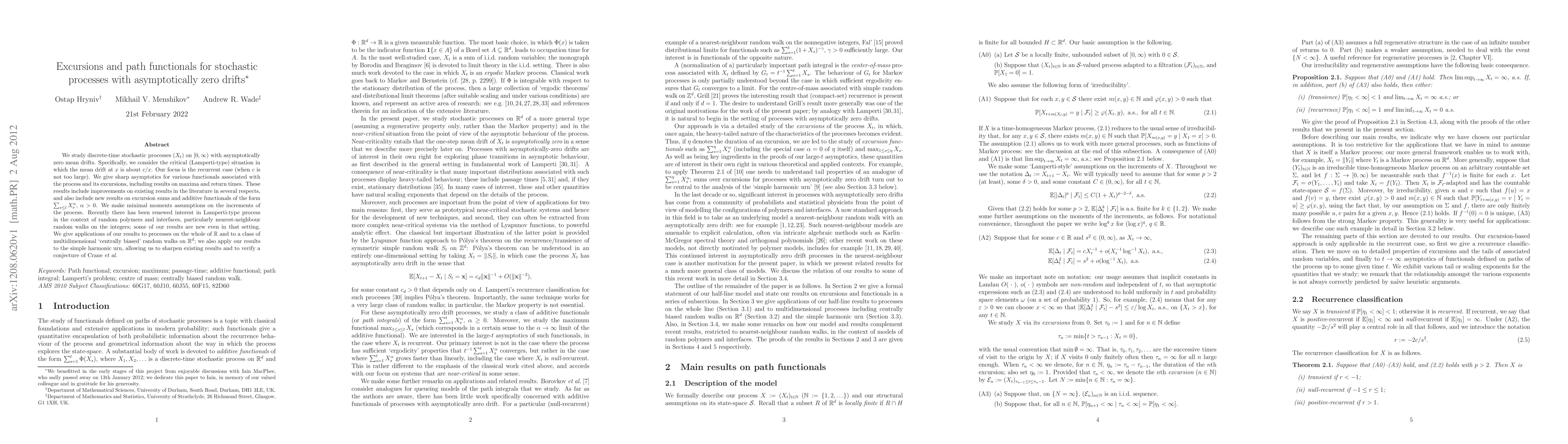 This paper investigates discrete-time stochastic processes with asymptotically zero mean drifts, focusing on Lamperti-type processes with mean drifts proportional to $c/x$. It provides sharp asymptotics for functionals related to the process and its excursions, including maxima and return times, and introduces new results on excursion sums and additive functionals. Applications extend to random polymers, interfaces, and multidimensional random walks.