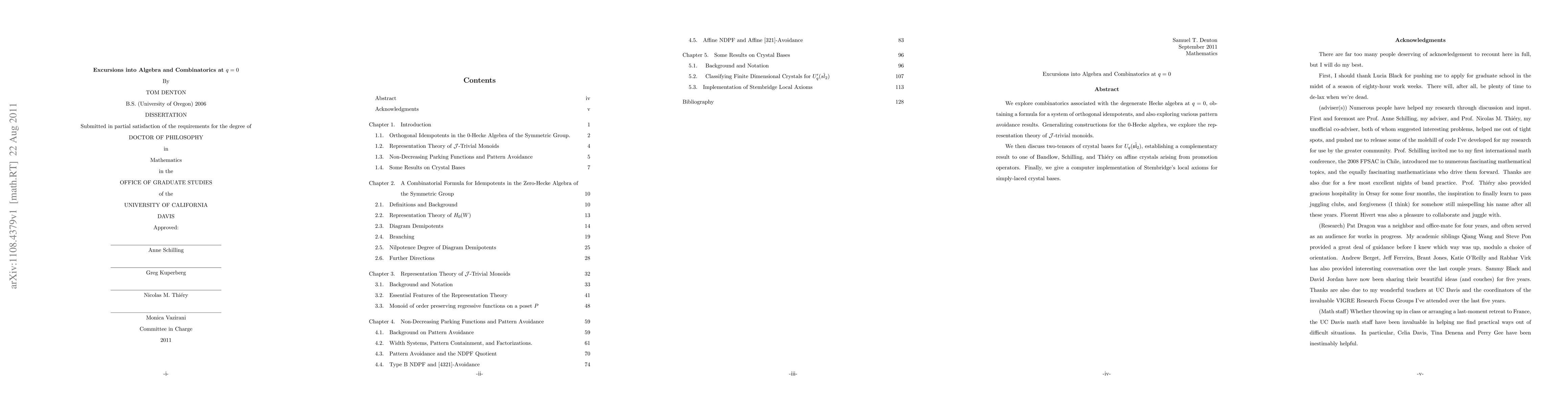 We explore combinatorics associated with the degenerate Hecke algebra at $q=0$, obtaining a formula for a system of orthogonal idempotents, and also exploring various pattern avoidance results. Generalizing constructions for the 0-Hecke algebra, we explore the representation theory of $\JJ$-trivial monoids. We then discuss two-tensors of crystal bases for $U_q(\tilde{\mathfrak{sl}_2})$, establishing a complementary result to one of Bandlow, Schilling, and Thi\'ery on affine crystals arising from promotion operators. Finally, we give a computer implementation of Stembridge's local axioms for simply-laced crystal bases.