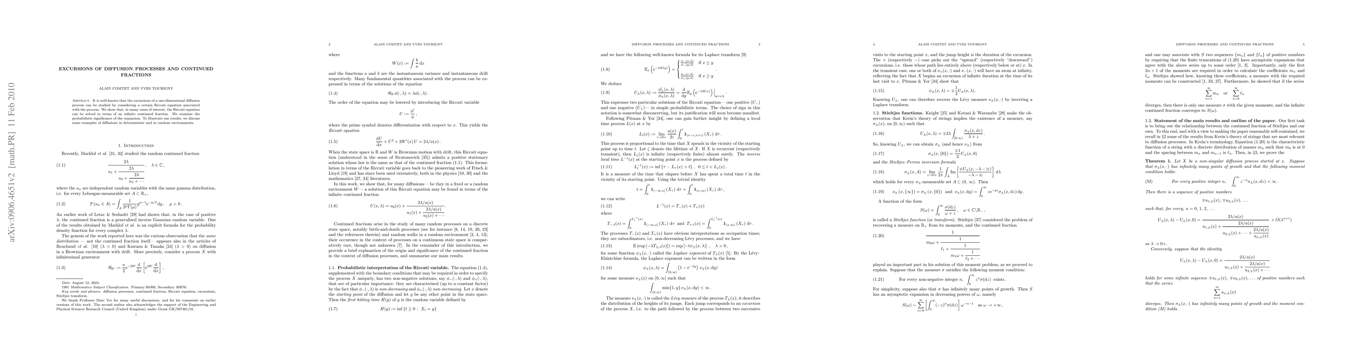 It is well-known that the excursions of a one-dimensional diffusion process can be studied by considering a certain Riccati equation associated with the process. We show that, in many cases of interest, the Riccati equation can be solved in terms of an infinite continued fraction. We examine the probabilistic significance of the expansion. To illustrate our results, we discuss some examples of diffusions in deterministic and in random environments.