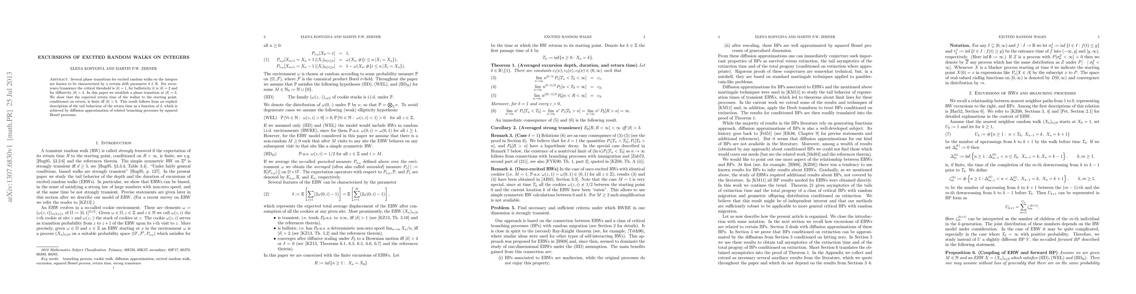 This paper identifies a new phase transition at |delta|=3 for excited random walks on integers, demonstrating that the expected return time to the starting point is finite only when |delta| exceeds 3. This conclusion is derived from a detailed analysis of the tail behavior of return times using diffusion approximation techniques applied to branching processes.