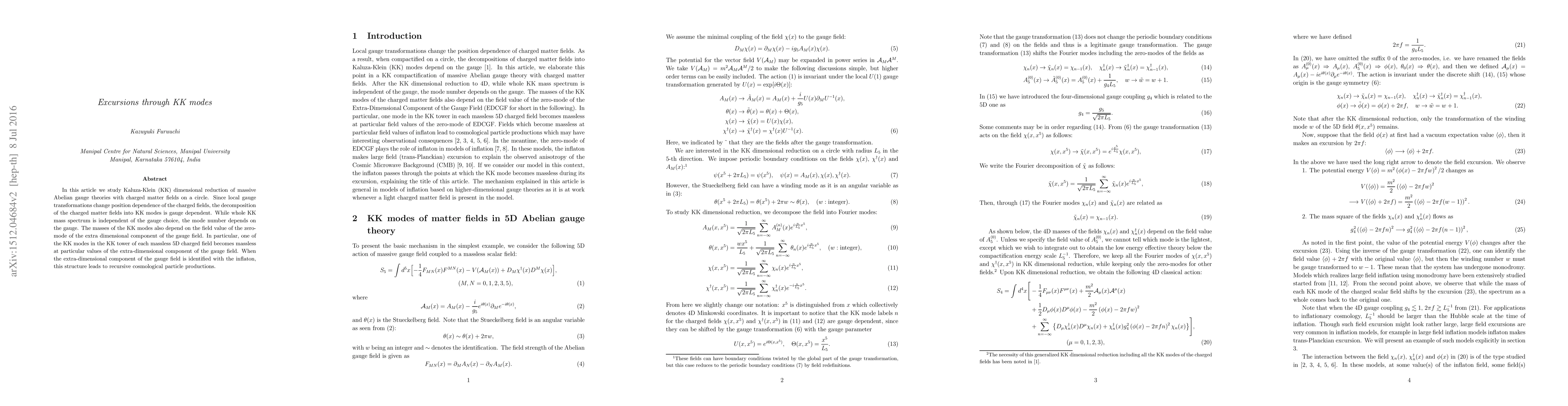 This paper explores the Kaluza-Klein (KK) dimensional reduction of massive Abelian gauge theories with charged matter fields on a circle, noting that the decomposition of these fields into KK modes is gauge dependent. It finds that while the KK mass spectrum is gauge independent, the mode number and KK mode masses are influenced by the field value of the extra-dimensional gauge field, leading to recursive cosmological particle productions when this field is identified with the inflaton.