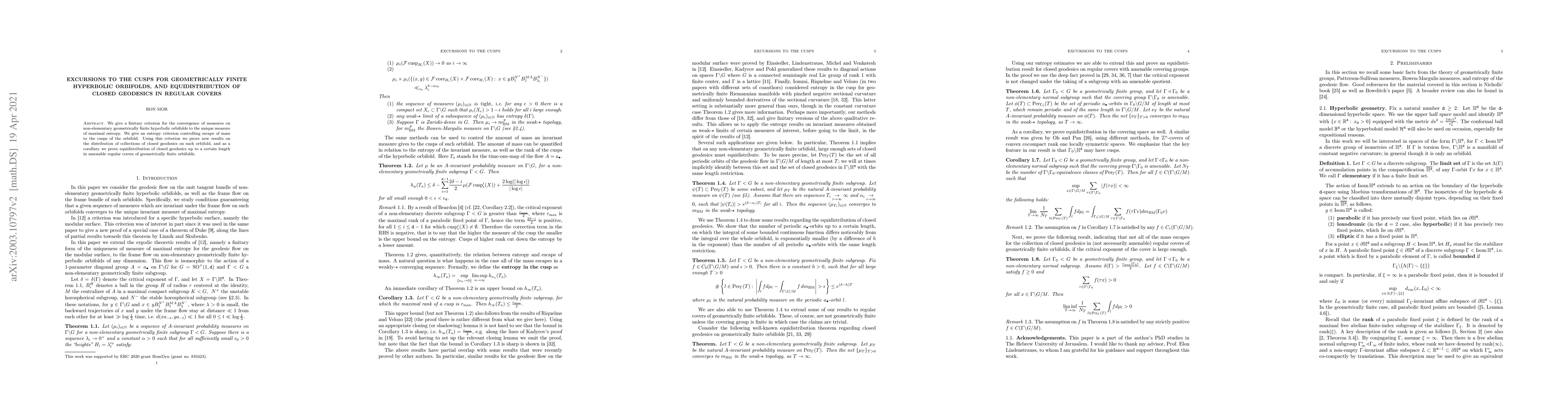 This paper presents a criterion for the convergence of measures on geometrically finite hyperbolic orbifolds to the maximal entropy measure, controlling mass escape to cusps. It also proves results on the distribution of closed geodesics and demonstrates equidistribution of such geodesics in regular covers of these orbifolds.