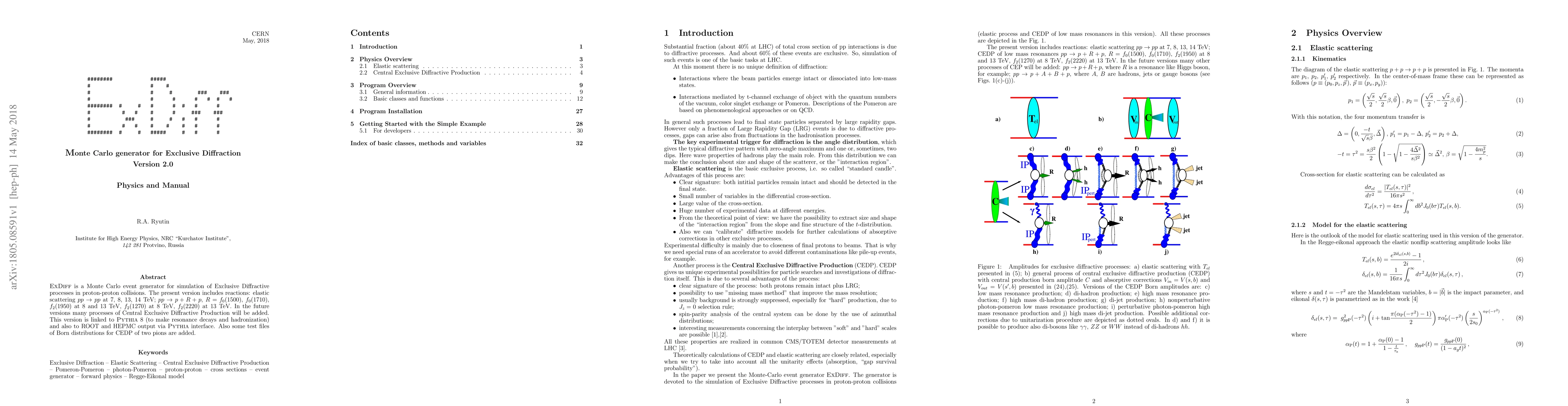ExDiff2.0 is a Monte Carlo generator for simulating exclusive diffractive processes in proton-proton collisions at various energies, including elastic scattering and production of specific resonances. It integrates with PYTHIA 8 for resonance decays and hadronization, and outputs data via ROOT and HEPMC.