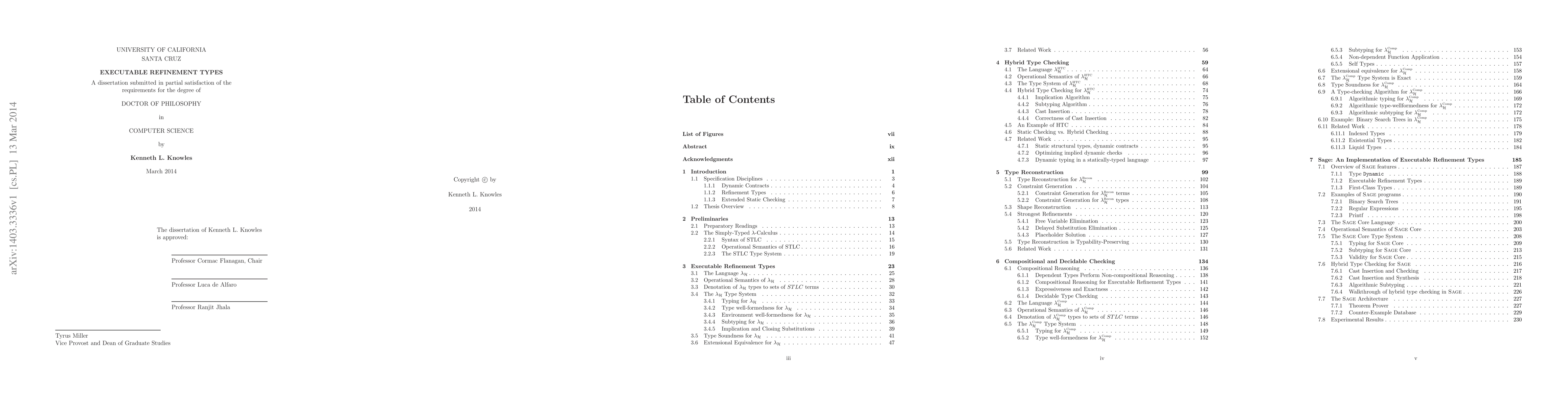 This dissertation develops executable refinement types to refine structural types with semi-decidable predicates, providing metatheory and implementation techniques. Key contributions include type soundness, hybrid type checking, decidable type reconstruction, and a prototype implementation that ensures dynamic errors become static.