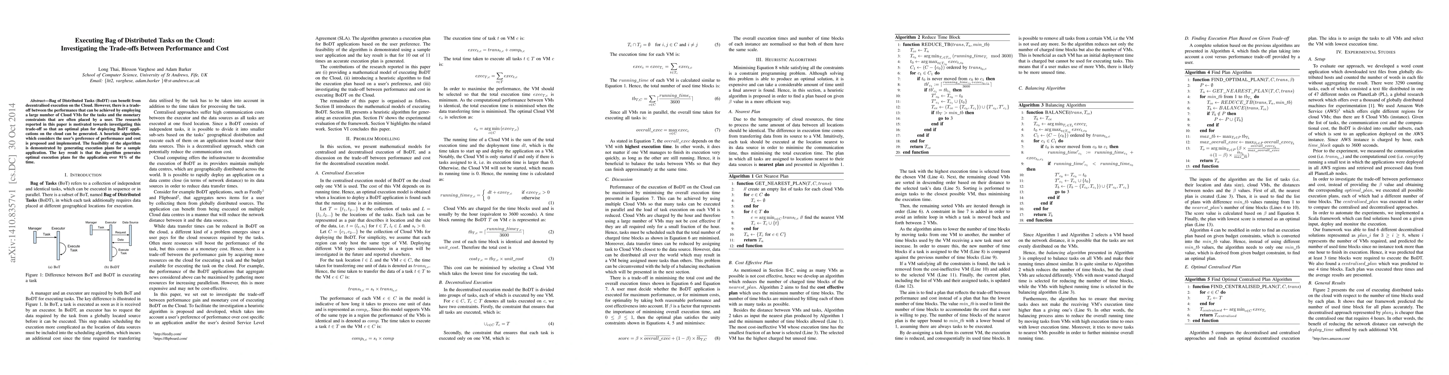 Bag of Distributed Tasks (BoDT) can benefit from decentralised execution on the Cloud. However, there is a trade-off between the performance that can be achieved by employing a large number of Cloud VMs for the tasks and the monetary constraints that are often placed by a user. The research reported in this paper is motivated towards investigating this trade-off so that an optimal plan for deploying BoDT applications on the cloud can be generated. A heuristic algorithm, which considers the user's preference of performance and cost is proposed and implemented. The feasibility of the algorithm is demonstrated by generating execution plans for a sample application. The key result is that the algorithm generates optimal execution plans for the application over 91\% of the time.