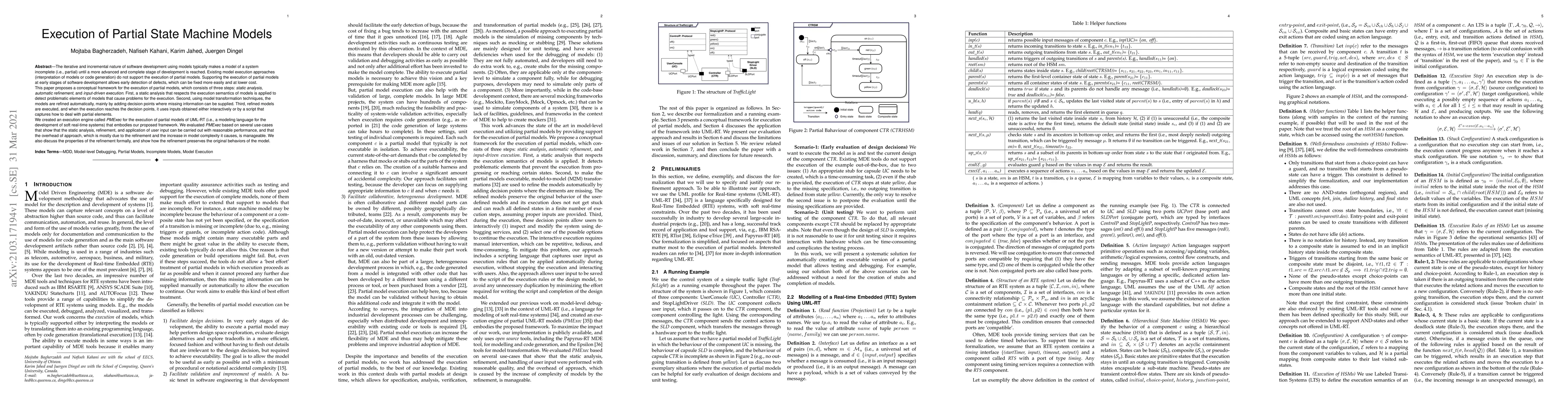 The iterative and incremental nature of software development using models typically makes a model of a system incomplete (i.e., partial) until a more advanced and complete stage of development is reached. Existing model execution approaches (interpretation of models or code generation) do not support the execution of partial models. Supporting the execution of partial models at the early stages of software development allows early detection of defects, which can be fixed more easily and at a lower cost. This paper proposes a conceptual framework for the execution of partial models, which consists of three steps: static analysis, automatic refinement, and input-driven execution. First, a static analysis that respects the execution semantics of models is applied to detect problematic elements of models that cause problems for the execution. Second, using model transformation techniques, the models are refined automatically, mainly by adding decision points where missing information can be supplied. Third, refined models are executed, and when the execution reaches the decision points, it uses inputs obtained either interactively or by a script that captures how to deal with partial elements. We created an execution engine called PMExec for the execution of partial models of UML-RT (i.e., a modeling language for the development of soft real-time systems) that embodies our proposed framework. We evaluated PMExec based on several use-cases that show that the static analysis, refinement, and application of user input can be carried out with reasonable performance and that the overhead of approach, which is mostly due to the refinement and the increase in model complexity it causes, is manageable. We also discuss the properties of the refinement formally and show how the refinement preserves the original behaviors of the model.