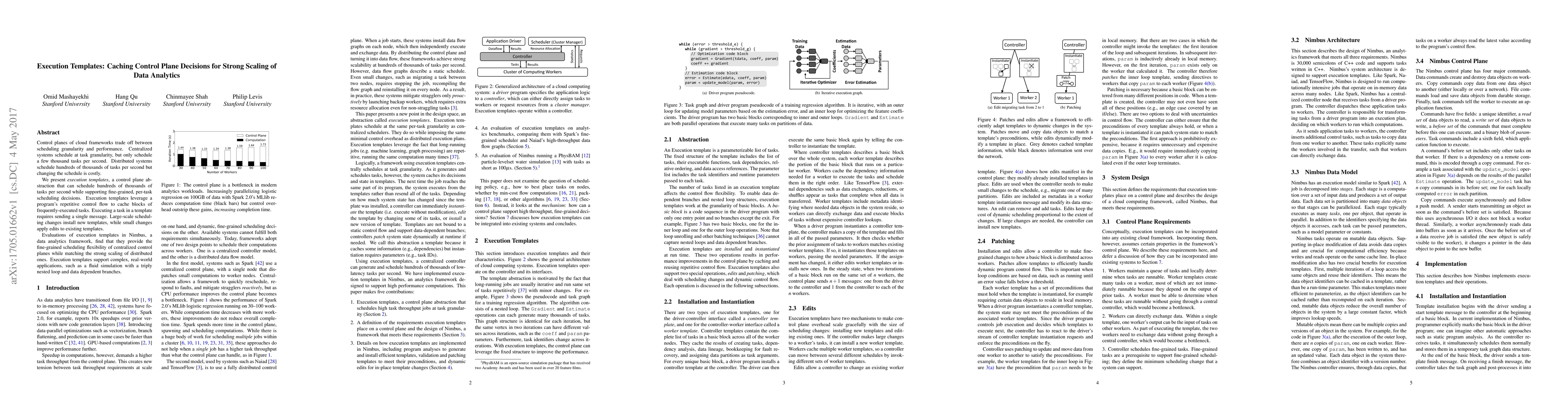 Control planes of cloud frameworks trade off between scheduling granularity and performance. Centralized systems schedule at task granularity, but only schedule a few thousand tasks per second. Distributed systems schedule hundreds of thousands of tasks per second but changing the schedule is costly. We present execution templates, a control plane abstraction that can schedule hundreds of thousands of tasks per second while supporting fine-grained, per-task scheduling decisions. Execution templates leverage a program's repetitive control flow to cache blocks of frequently-executed tasks. Executing a task in a template requires sending a single message. Large-scale scheduling changes install new templates, while small changes apply edits to existing templates. Evaluations of execution templates in Nimbus, a data analytics framework, find that they provide the fine-grained scheduling flexibility of centralized control planes while matching the strong scaling of distributed ones. Execution templates support complex, real-world applications, such as a fluid simulation with a triply nested loop and data dependent branches.