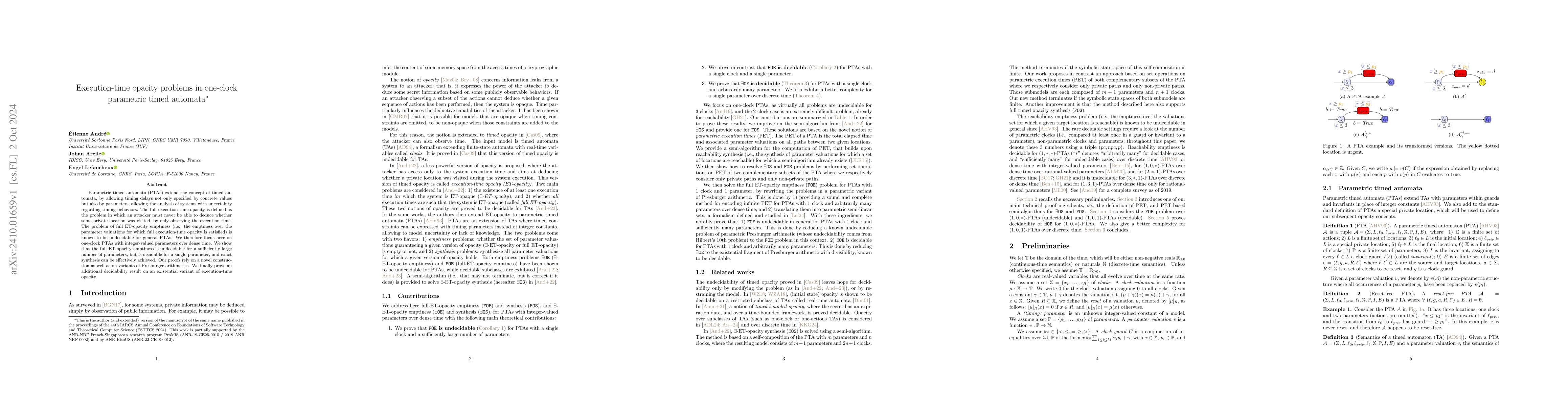 The paper discusses the undecidability of ensuring full execution-time opacity in one-clock parametric timed automata with integer parameters, establishing decidability for a single parameter and presenting novel constructions and proofs based on Presburger arithmetic. It also proves a decidability result for an existential variant of execution-time opacity.