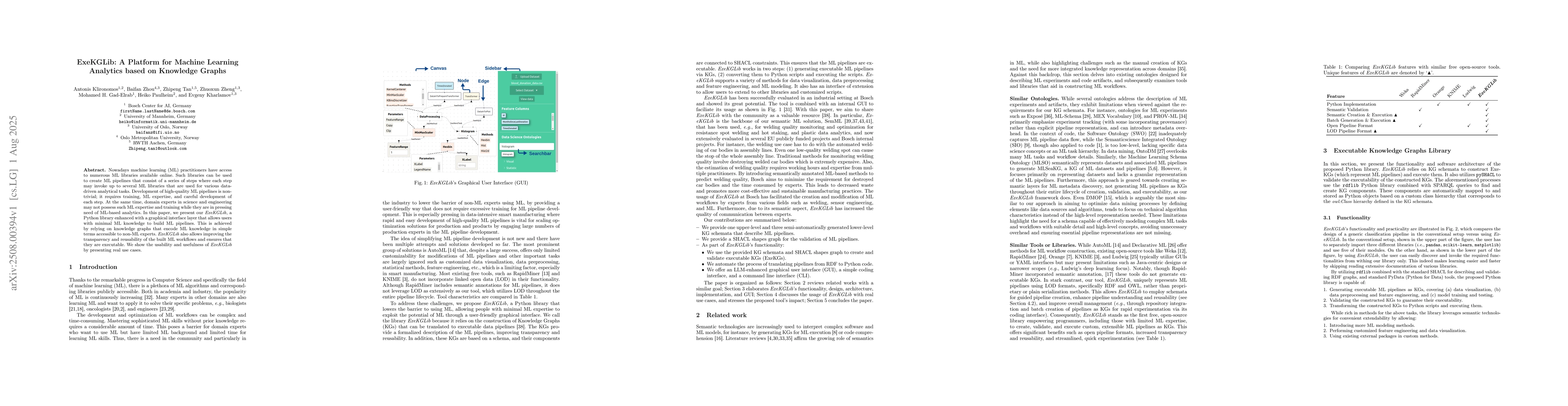 Nowadays machine learning (ML) practitioners have access to numerous ML libraries available online. Such libraries can be used to create ML pipelines that consist of a series of steps where each step may invoke up to several ML libraries that are used for various data-driven analytical tasks. Development of high-quality ML pipelines is non-trivial; it requires training, ML expertise, and careful development of each step. At the same time, domain experts in science and engineering may not possess such ML expertise and training while they are in pressing need of ML-based analytics. In this paper, we present our ExeKGLib, a Python library enhanced with a graphical interface layer that allows users with minimal ML knowledge to build ML pipelines. This is achieved by relying on knowledge graphs that encode ML knowledge in simple terms accessible to non-ML experts. ExeKGLib also allows improving the transparency and reusability of the built ML workflows and ensures that they are executable. We show the usability and usefulness of ExeKGLib by presenting real use cases.