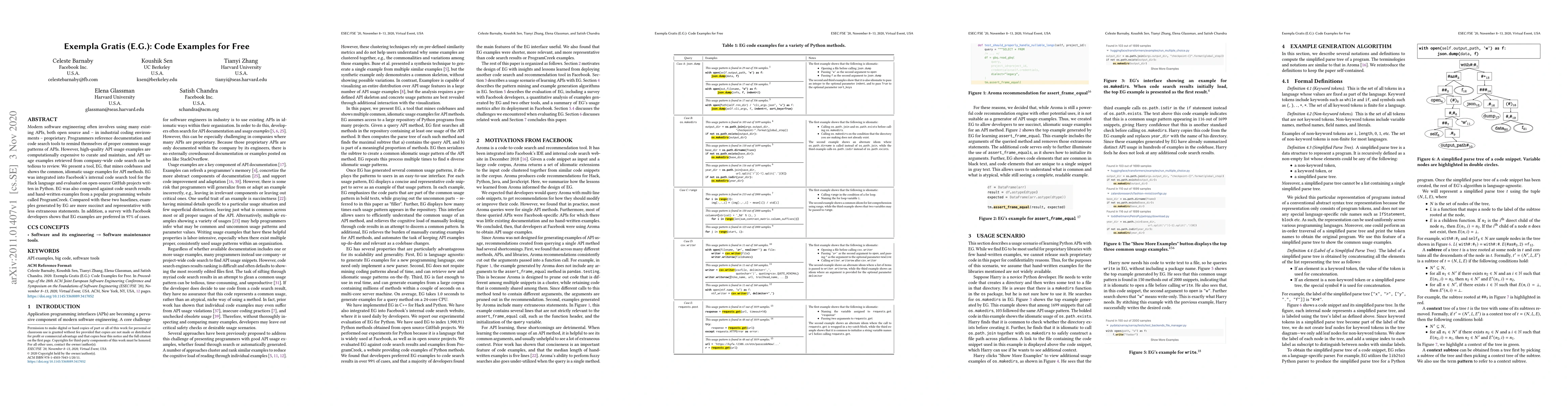 The paper introduces EG, a tool that mines codebases to provide succinct, representative usage examples for API methods, which is evaluated against code search results and hand-written examples. EG examples are preferred by Facebook developers in 97 percent of cases, demonstrating their effectiveness.