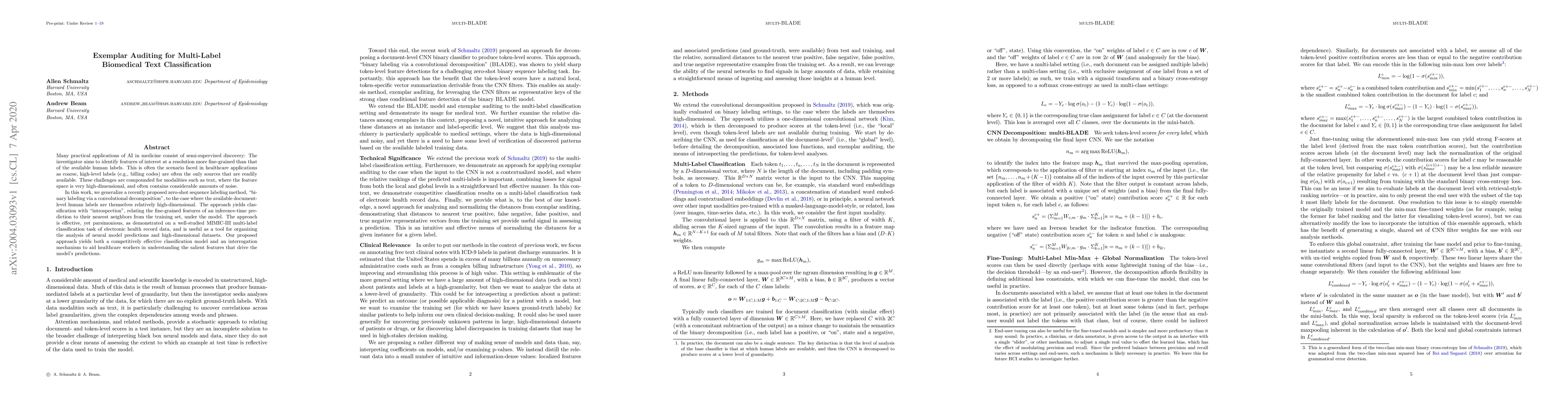 Many practical applications of AI in medicine consist of semi-supervised discovery: The investigator aims to identify features of interest at a resolution more fine-grained than that of the available human labels. This is often the scenario faced in healthcare applications as coarse, high-level labels (e.g., billing codes) are often the only sources that are readily available. These challenges are compounded for modalities such as text, where the feature space is very high-dimensional, and often contains considerable amounts of noise. In this work, we generalize a recently proposed zero-shot sequence labeling method, "binary labeling via a convolutional decomposition", to the case where the available document-level human labels are themselves relatively high-dimensional. The approach yields classification with "introspection", relating the fine-grained features of an inference-time prediction to their nearest neighbors from the training set, under the model. The approach is effective, yet parsimonious, as demonstrated on a well-studied MIMIC-III multi-label classification task of electronic health record data, and is useful as a tool for organizing the analysis of neural model predictions and high-dimensional datasets. Our proposed approach yields both a competitively effective classification model and an interrogation mechanism to aid healthcare workers in understanding the salient features that drive the model's predictions.