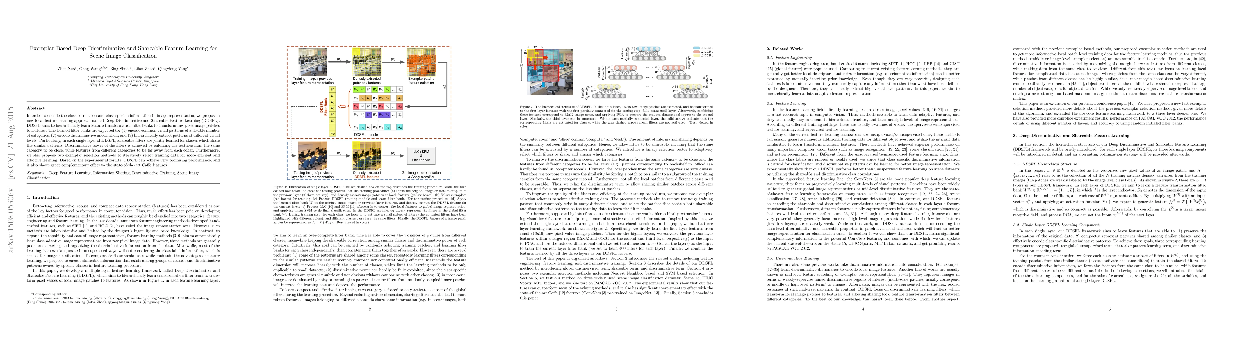 A new approach called Deep Discriminative and Shareable Feature Learning (DDSFL) is proposed for scene image classification, which aims to learn feature transformation filter banks that encode common patterns and discriminative information in a hierarchical manner. The method achieves promising performance and complements state-of-the-art features with great effectiveness.
