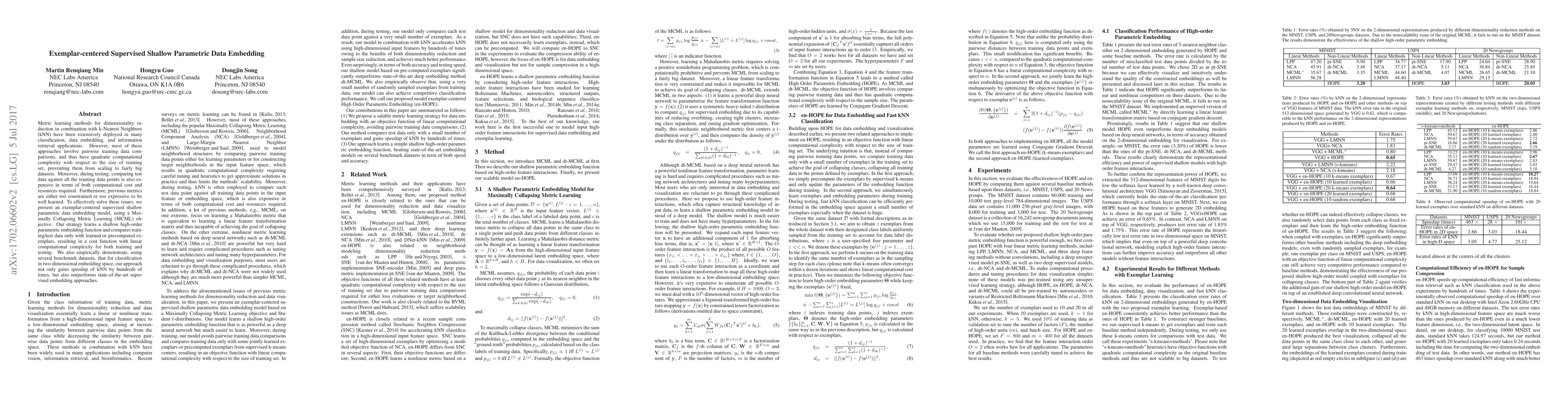 Metric learning methods for dimensionality reduction in combination with k-Nearest Neighbors (kNN) have been extensively deployed in many classification, data embedding, and information retrieval applications. However, most of these approaches involve pairwise training data comparisons, and thus have quadratic computational complexity with respect to the size of training set, preventing them from scaling to fairly big datasets. Moreover, during testing, comparing test data against all the training data points is also expensive in terms of both computational cost and resources required. Furthermore, previous metrics are either too constrained or too expressive to be well learned. To effectively solve these issues, we present an exemplar-centered supervised shallow parametric data embedding model, using a Maximally Collapsing Metric Learning (MCML) objective. Our strategy learns a shallow high-order parametric embedding function and compares training/test data only with learned or precomputed exemplars, resulting in a cost function with linear computational complexity for both training and testing. We also empirically demonstrate, using several benchmark datasets, that for classification in two-dimensional embedding space, our approach not only gains speedup of kNN by hundreds of times, but also outperforms state-of-the-art supervised embedding approaches.