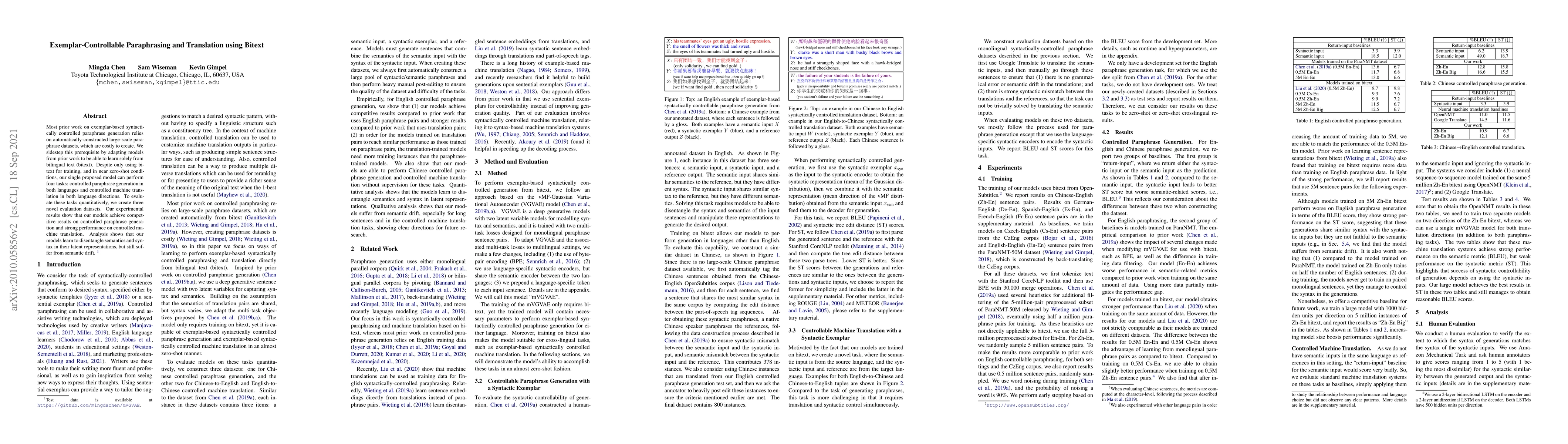 Most prior work on exemplar-based syntactically controlled paraphrase generation relies on automatically-constructed large-scale paraphrase datasets, which are costly to create. We sidestep this prerequisite by adapting models from prior work to be able to learn solely from bilingual text (bitext). Despite only using bitext for training, and in near zero-shot conditions, our single proposed model can perform four tasks: controlled paraphrase generation in both languages and controlled machine translation in both language directions. To evaluate these tasks quantitatively, we create three novel evaluation datasets. Our experimental results show that our models achieve competitive results on controlled paraphrase generation and strong performance on controlled machine translation. Analysis shows that our models learn to disentangle semantics and syntax in their latent representations, but still suffer from semantic drift.