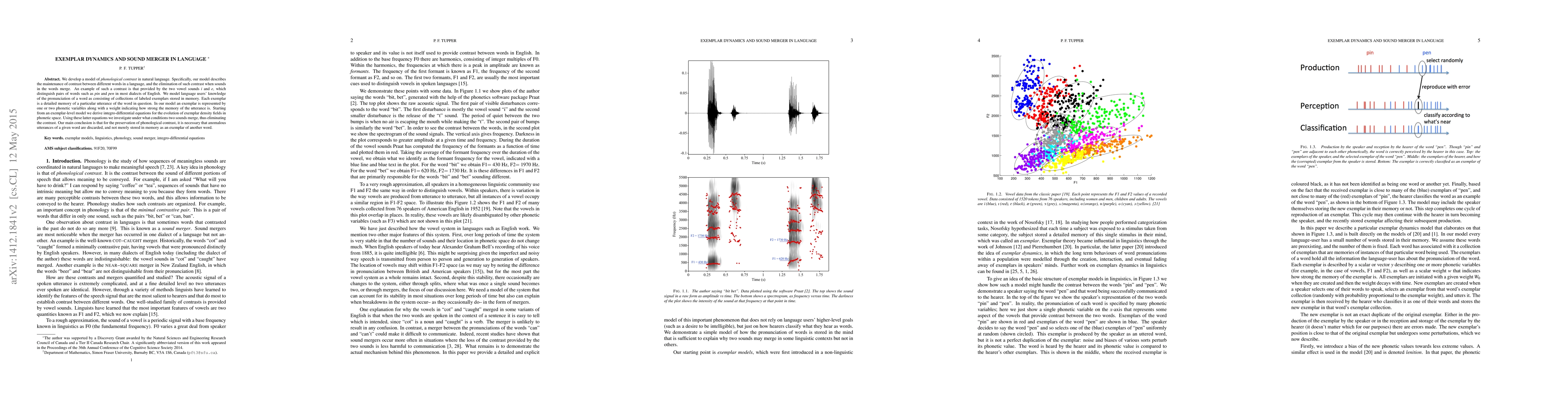 We develop a model of phonological contrast in natural language. Specifically, the model describes the maintenance of contrast between different words in a language, and the elimination of such contrast when sounds in the words merge. An example of such a contrast is that provided by the two vowel sounds 'i' and 'e', which distinguish pairs of words such as 'pin' and 'pen' in most dialects of English. We model language users' knowledge of the pronunciation of a word as consisting of collections of labeled exemplars stored in memory. Each exemplar is a detailed memory of a particular utterance of the word in question. In our model an exemplar is represented by one or two phonetic variables along with a weight indicating how strong the memory of the utterance is. Starting from an exemplar-level model we derive integro-differential equations for the evolution of exemplar density fields in phonetic space. Using these latter equations we investigate under what conditions two sounds merge, thus eliminating the contrast. Our main conclusion is that for the preservation of phonological contrast, it is necessary that anomalous utterances of a given word are discarded, and not merely stored in memory as an exemplar of another word.
