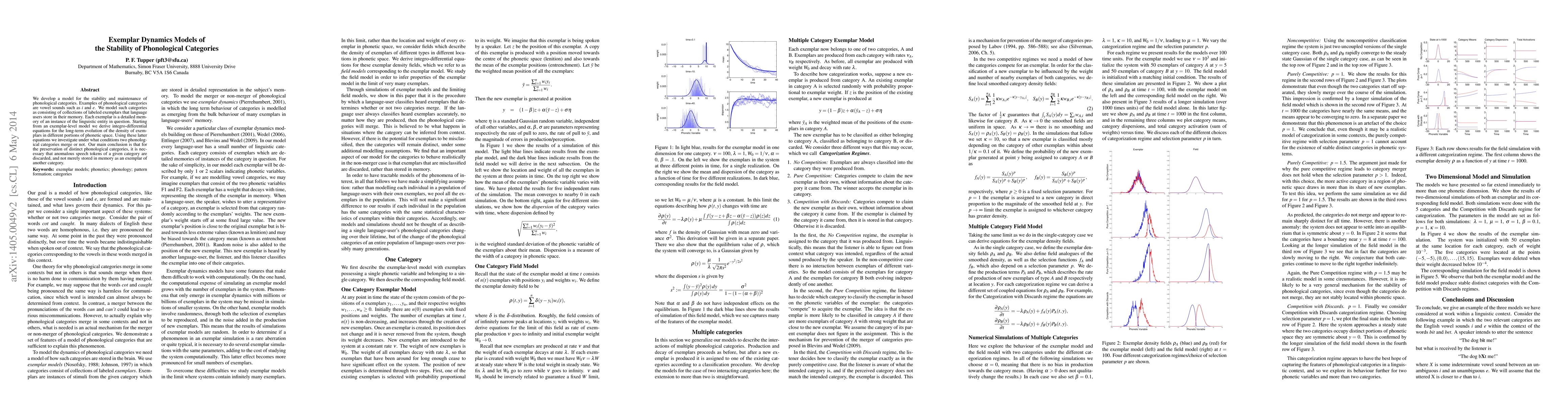 This research introduces an exemplar dynamics model to explain the stability of phonological categories like vowel sounds. By representing categories as collections of detailed exemplars, the study derives equations showing conditions under which categories merge or remain distinct, concluding that anomalous tokens must be discarded for category preservation.