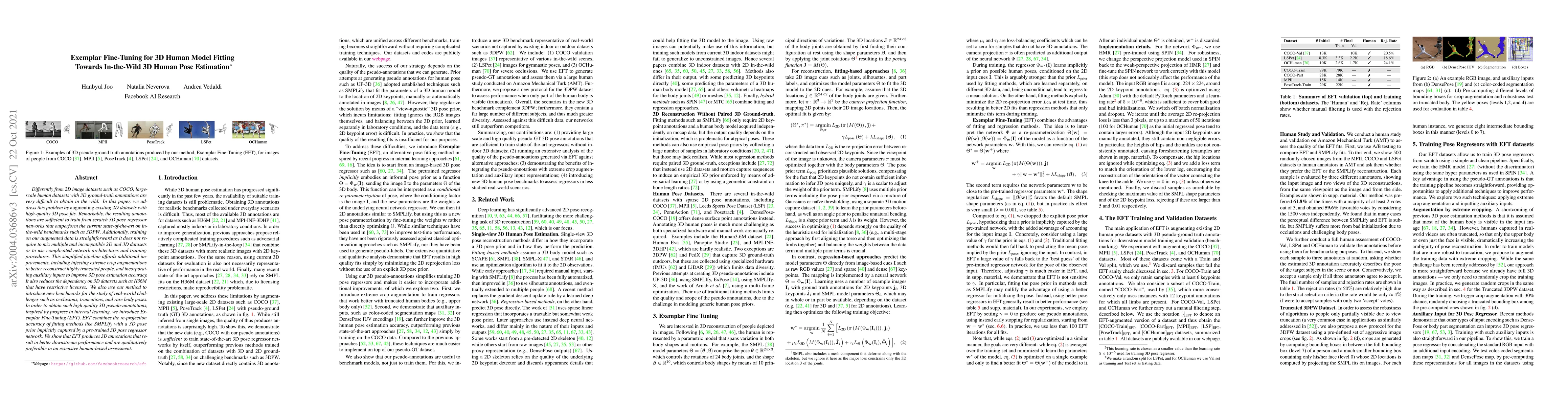 Differently from 2D image datasets such as COCO, large-scale human datasets with 3D ground-truth annotations are very difficult to obtain in the wild. In this paper, we address this problem by augmenting existing 2D datasets with high-quality 3D pose fits. Remarkably, the resulting annotations are sufficient to train from scratch 3D pose regressor networks that outperform the current state-of-the-art on in-the-wild benchmarks such as 3DPW. Additionally, training on our augmented data is straightforward as it does not require to mix multiple and incompatible 2D and 3D datasets or to use complicated network architectures and training procedures. This simplified pipeline affords additional improvements, including injecting extreme crop augmentations to better reconstruct highly truncated people, and incorporating auxiliary inputs to improve 3D pose estimation accuracy. It also reduces the dependency on 3D datasets such as H36M that have restrictive licenses. We also use our method to introduce new benchmarks for the study of real-world challenges such as occlusions, truncations, and rare body poses. In order to obtain such high quality 3D pseudo-annotations, inspired by progress in internal learning, we introduce Exemplar Fine-Tuning (EFT). EFT combines the re-projection accuracy of fitting methods like SMPLify with a 3D pose prior implicitly captured by a pre-trained 3D pose regressor network. We show that EFT produces 3D annotations that result in better downstream performance and are qualitatively preferable in an extensive human-based assessment.