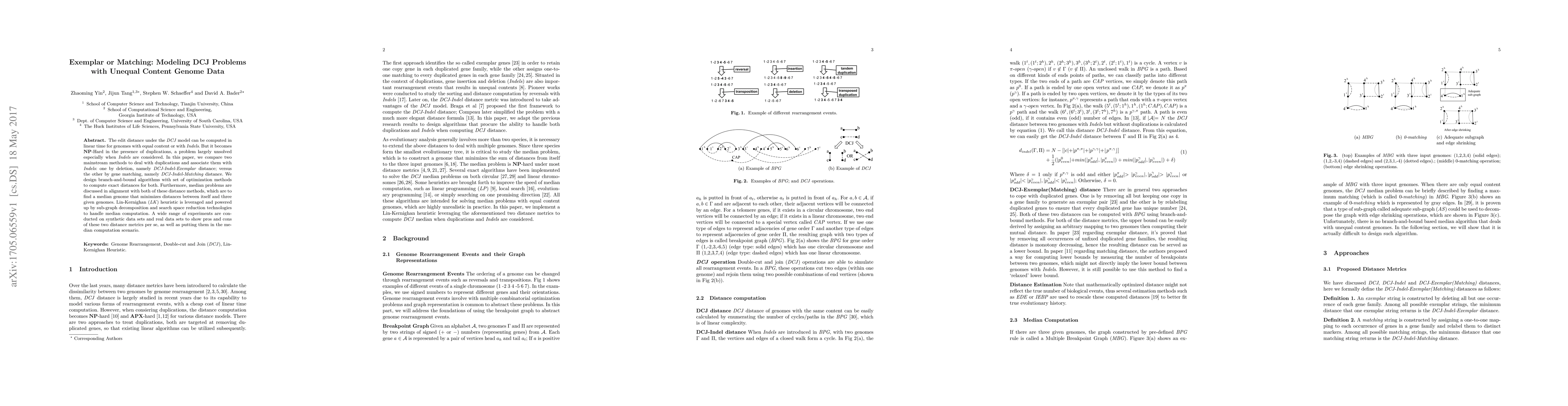 This paper compares two methods for computing edit distances under the DCJ model for genomes with unequal content and duplications: DCJ-Indel-Exemplar and DCJ-Indel-Matching. It proposes branch-and-bound algorithms to compute exact distances and discusses median genome problems, using Lin-Kernighan heuristics enhanced by subgraph decomposition for efficient computation.