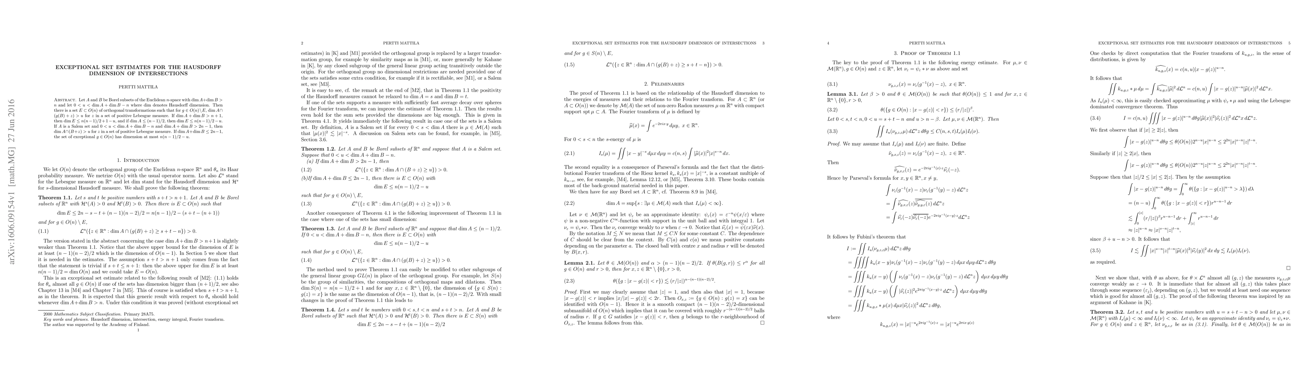 For Borel subsets A and B of the Euclidean n-space the intersection of A with generic rotations and translations of B has often Hausdorff dimension at least dim A + dim B - n. Estimates for the exceptional set of rotations are derived.