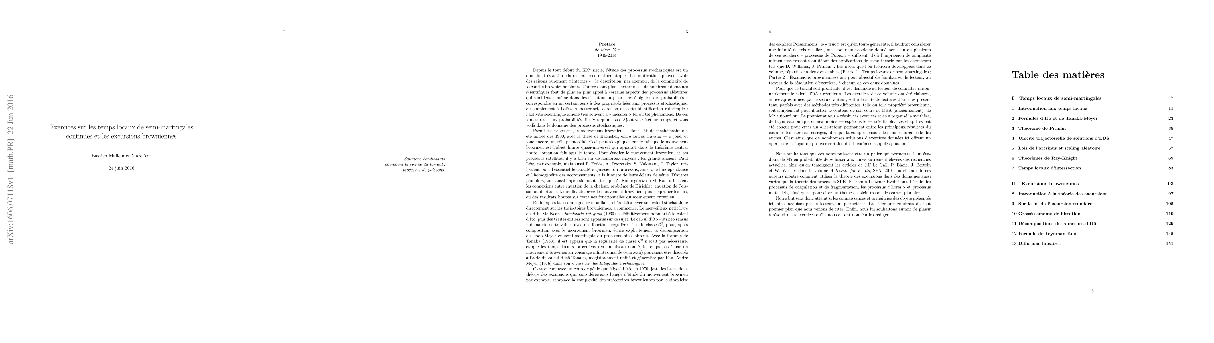Depuis le tout d\'ebut du XX${}^\text{e}$ si\`ecle, l'\'etude des processus stochastiques est un domaine tr\`es actif de la recherche en math\'ematiques. Parmi ces processus, le mouvement brownien --- dont l'\'etude math\'ematique a \'et\'e initi\'ee d\`es 1900, avec la th\`ese de Bachelier, entre autres travaux --- a jou\'e, et joue encore, un r\^ole primordial. Ceci peut s'expliquer par le fait que le mouvement brownien est l'objet limite quasi-universel qui appara\^it dans le th\'eor\`eme central limite, lorsqu'on fait agir le temps. Depuis la fin de la seconde guerre mondiale et les travaux d'It\^o, Meyer, Tanaka et bien d'autres, les temps locaux et les excursions sont devenus des outils essentiels pour \'etudier ce processus. Les exercices de ce volume ont \'et\'e \'elabor\'es, ann\'ee apr\`es ann\'ee, par le second auteur, soit \`a la suite de lectures d'articles pr\'esentant, parfois avec des m\'ethodes tr\`es diff\'erentes, telle ou telle propri\'et\'e brownienne, soit simplement pour illustrer le contenu de son cours de DEA (anciennement), de M2 aujourd'hui. Le premier auteur en a organis\'e la synth\`ese, de fa\c{c}on \'economique et n\'eanmoins --- esp\'erons-le --- tr\`es lisible. Les chapitres ont \'et\'e con\c{c}us pour cr\'eer un aller-retour permanent entre les principaux r\'esultats du cours et les exercices corrig\'es, afin que la compr\'ehension des uns renforce celle des autres. C'est ainsi que de nombreuses solutions d'exercices donn\'ees ici offrent un aper\c{c}u de la fa\c{c}on de prouver certains des th\'eor\`emes rappel\'es plus haut.