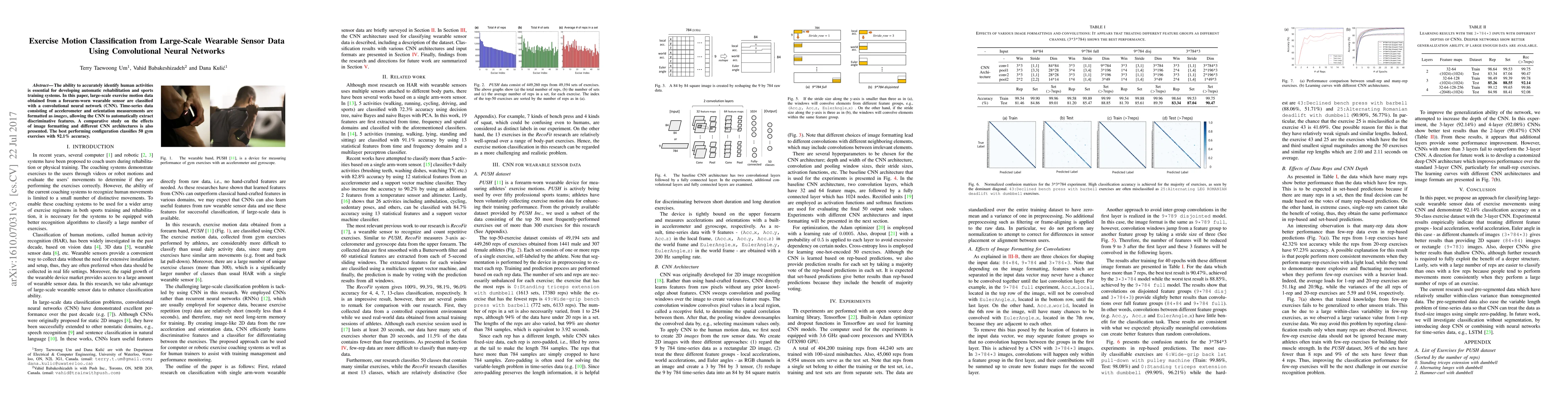 The ability to accurately identify human activities is essential for developing automatic rehabilitation and sports training systems. In this paper, large-scale exercise motion data obtained from a forearm-worn wearable sensor are classified with a convolutional neural network (CNN). Time-series data consisting of accelerometer and orientation measurements are formatted as images, allowing the CNN to automatically extract discriminative features. A comparative study on the effects of image formatting and different CNN architectures is also presented. The best performing configuration classifies 50 gym exercises with 92.1% accuracy.