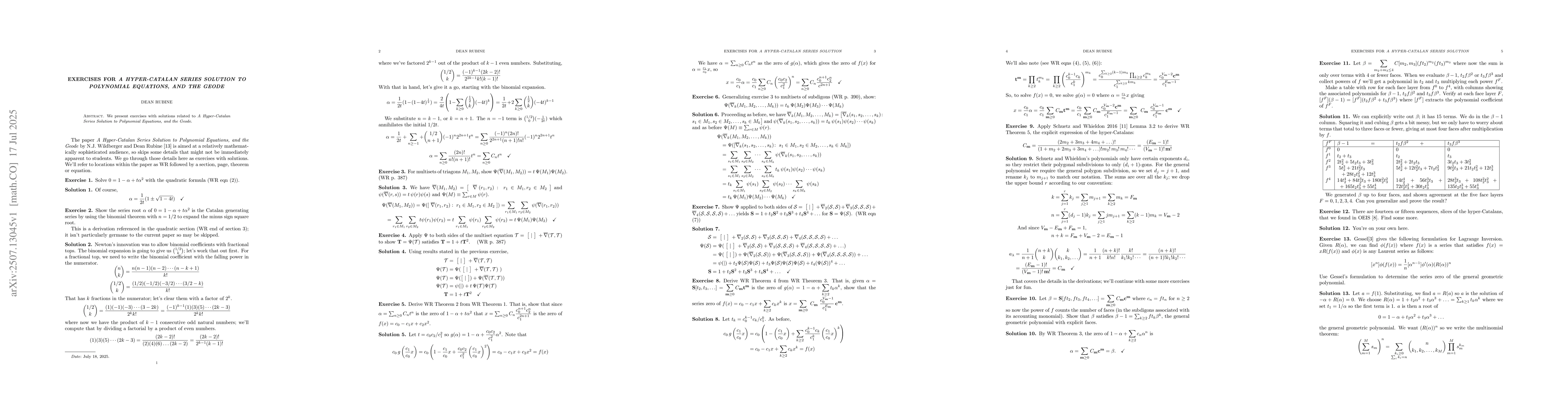 We present exercises with solutions related to A Hyper-Catalan Series Solution to Polynomial Equations, and the Geode.