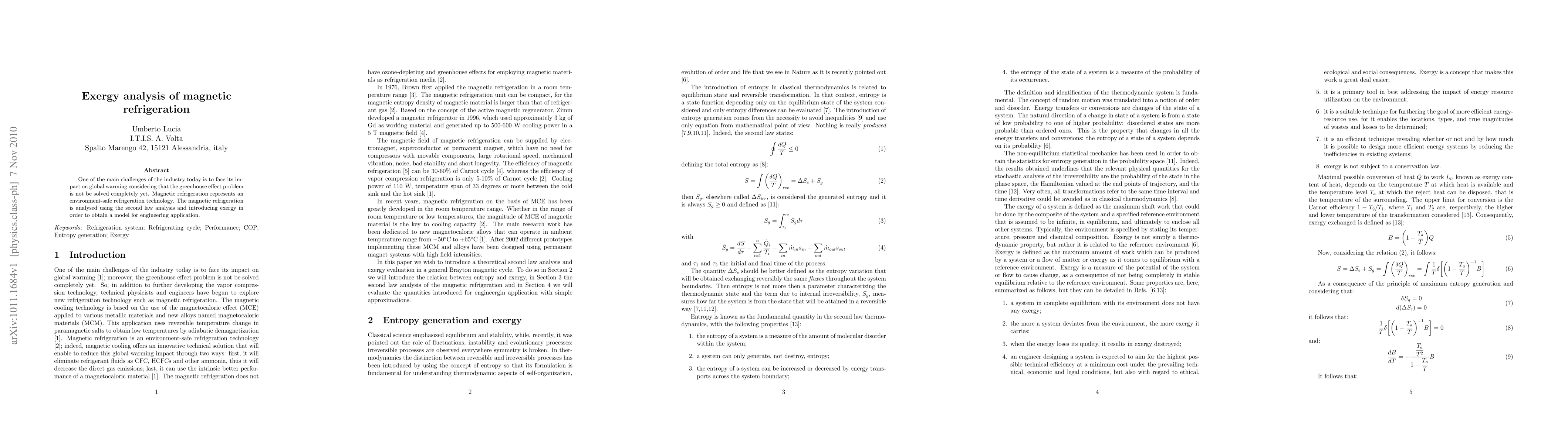 One of the main challenges of the industry today is to face its impact on global warming considering that the greenhouse effect problem is not be solved completely yet. Magnetic refrigeration represents an environment-safe refrigeration technology. The magnetic refrigeration is analysed using the second law analysis and introducing exergy in order to obtain a model for engineering application.