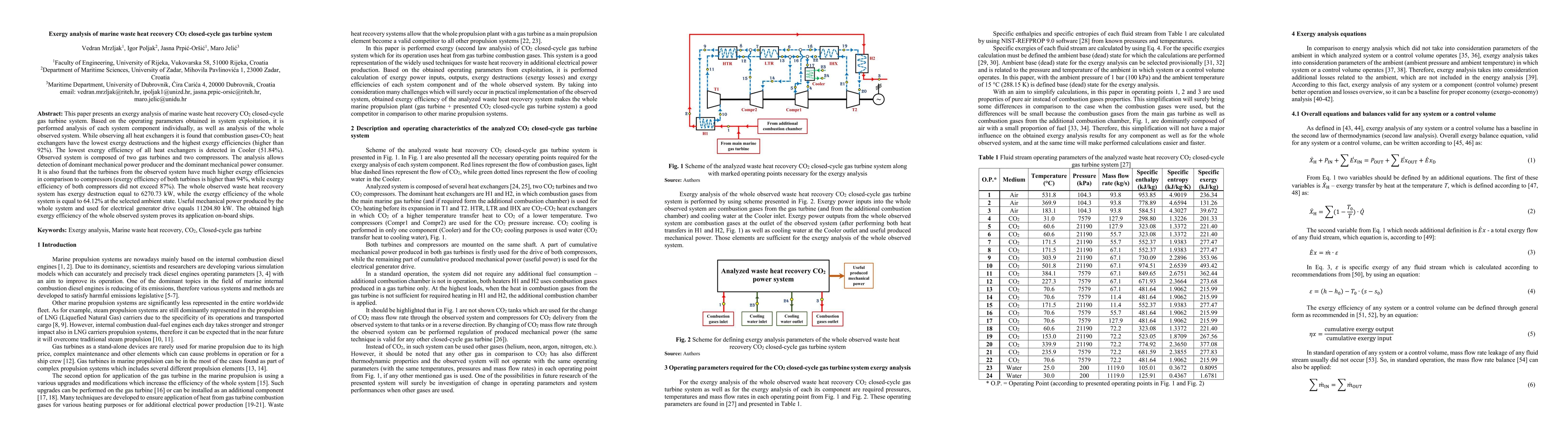 This paper presents an exergy analysis of marine waste heat recovery CO2 closed-cycle gas turbine system. Based on the operating parameters obtained in system exploitation, it is performed analysis of each system component individually, as well as analysis of the whole observed system. While observing all heat exchangers it is found that combustion gases-CO2 heat exchangers have the lowest exergy destructions and the highest exergy efficiencies (higher than 92%). The lowest exergy efficiency of all heat exchangers is detected in Cooler (51.84%). Observed system is composed of two gas turbines and two compressors. The analysis allows detection of dominant mechanical power producer and the dominant mechanical power consumer. It is also found that the turbines from the observed system have much higher exergy efficiencies in comparison to compressors (exergy efficiency of both turbines is higher than 94%, while exergy efficiency of both compressors did not exceed 87%). The whole observed waste heat recovery system has exergy destruction equal to 6270.73 kW, while the exergy efficiency of the whole system is equal to 64.12% at the selected ambient state. Useful mechanical power produced by the whole system and used for electrical generator drive equals 11204.80 kW. The obtained high exergy efficiency of the whole observed system proves its application on-board ships.
