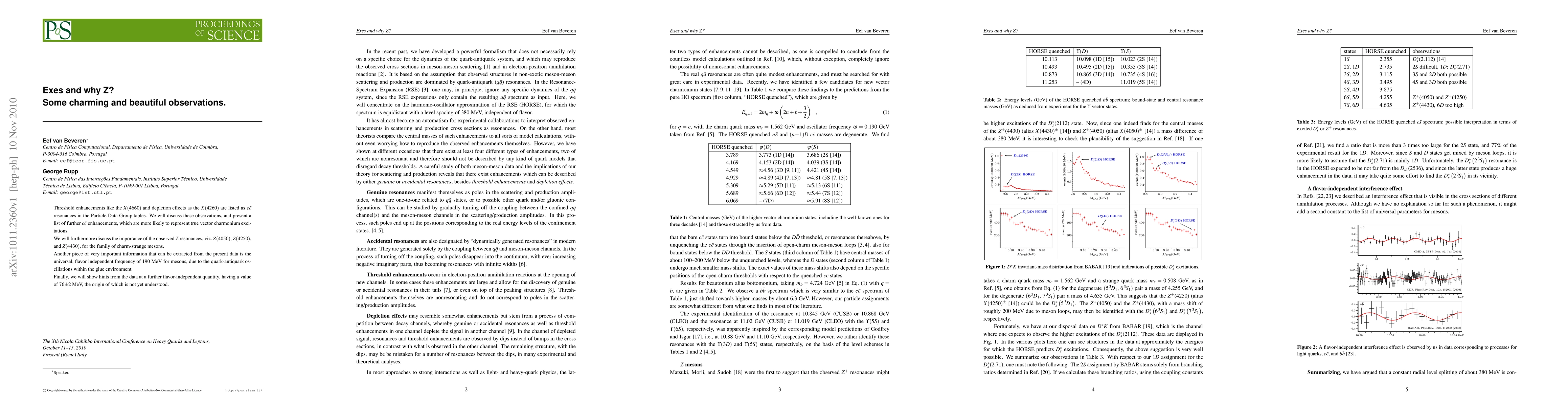 Threshold enhancements like the X(4660) and depletion effects as the X(4260) are listed as c-cbar resonances in the Particle Data Group tables. We will discuss these observations, and present a list of further c-cbar enhancements, which are more likely to represent true vector charmonium excitations. We will furthermore discuss the importance of the observed Z resonances, viz. Z(4050), Z(4250), and Z(4430), for the family of charm-strange mesons. Another piece of very important information that can be extracted from the present data is the universal, flavor independent frequency of 190 MeV for mesons, due to the quark-antiquark oscillations within the glue environment. Finally, we will show hints from the data at a further flavor-independent quantity, having a value of 76 +-2 MeV, the origin of which is not yet understood. Talk available at http://cft.fis.uc.pt/eef/Frascati2010start.htm