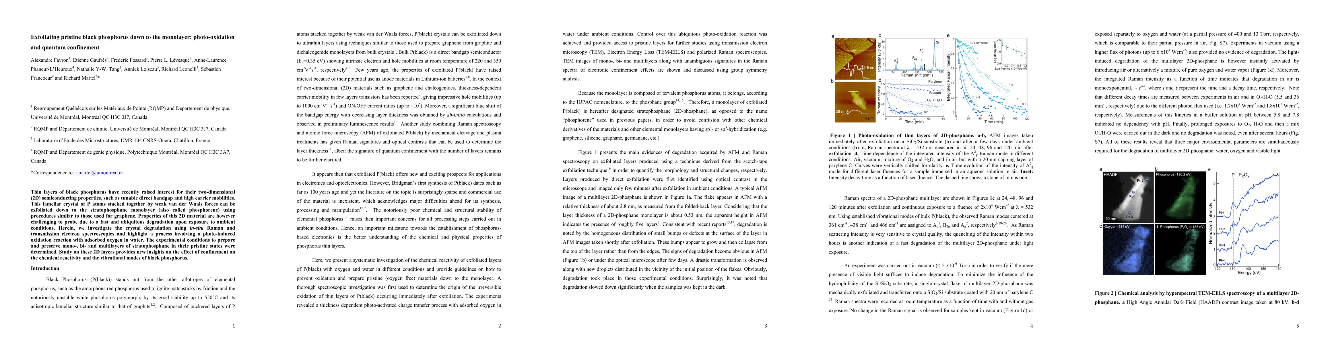 This paper explores the exfoliation of black phosphorus down to monolayer phosphorene, investigating its photo-oxidation degradation and electronic confinement effects. The study identifies photo-induced oxidation as a key degradation mechanism and provides methods to preserve the material, revealing insights into confinement's impact on reactivity and vibrational modes.