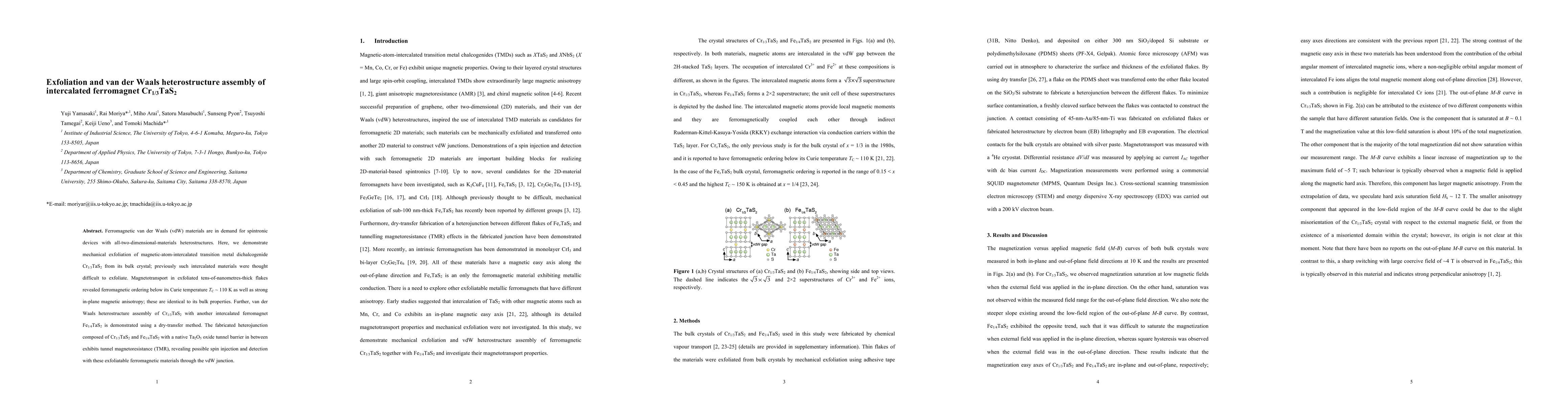 This paper demonstrates the successful exfoliation of magnetic-atom-intercalated Cr1/3TaS2, revealing its ferromagnetic properties and strong in-plane magnetic anisotropy. It also showcases the assembly of van der Waals heterostructures with Fe1/4TaS2, exhibiting tunnel magnetoresistance, indicating potential for spintronic applications.