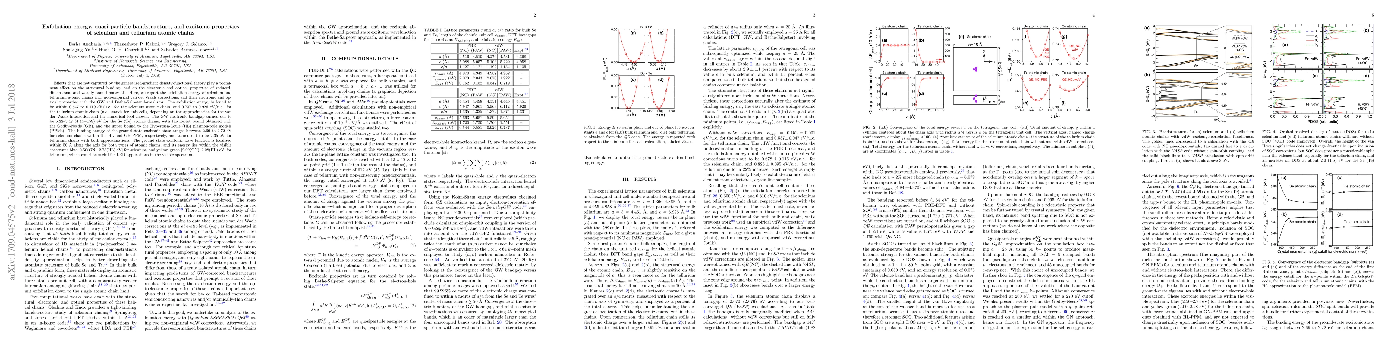 This research investigates the exfoliation energy and electronic/optical properties of selenium and tellurium atomic chains using non-empirical van der Waals corrections and GW/Bethe-Salpeter formalisms. Exfoliation energies vary between 0.547-0.926 eV/u.c., and the electronic bandgaps are 5.22-5.47 eV for selenium and 4.44-4.59 eV for tellurium, with excitonic binding energies suitable for visible spectrum LEDs.