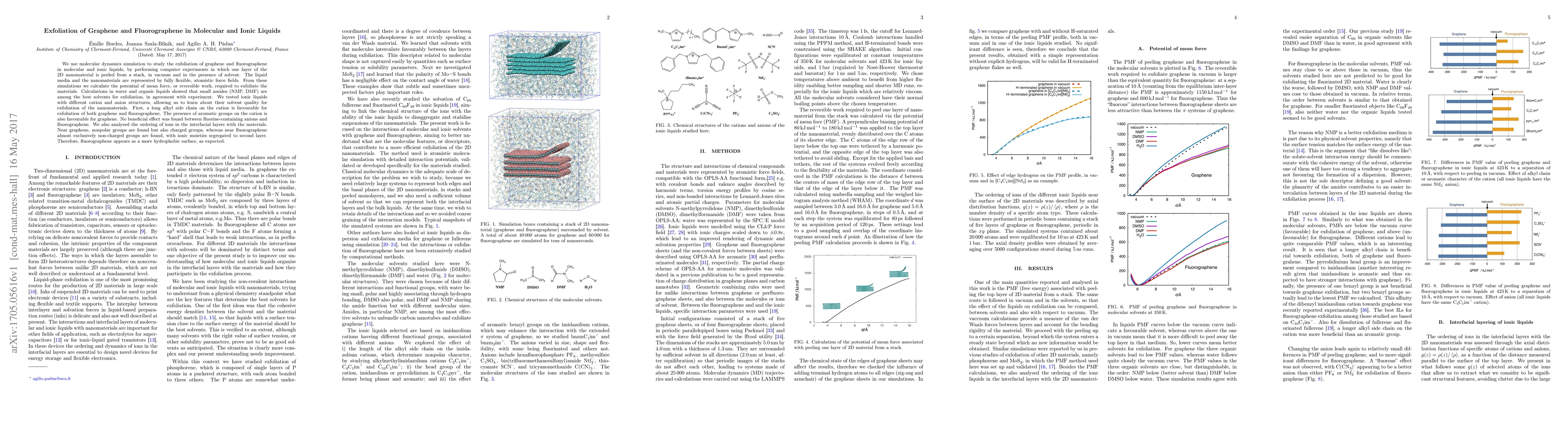 This research uses molecular dynamics simulations to examine the exfoliation of graphene and fluorographene in various molecular and ionic liquids. Small amides like NMP and DMF are identified as effective solvents for exfoliation, with long alkyl side chains on ionic liquid cations favoring exfoliation for both materials, while fluorine-containing anions do not aid fluorographene exfoliation.