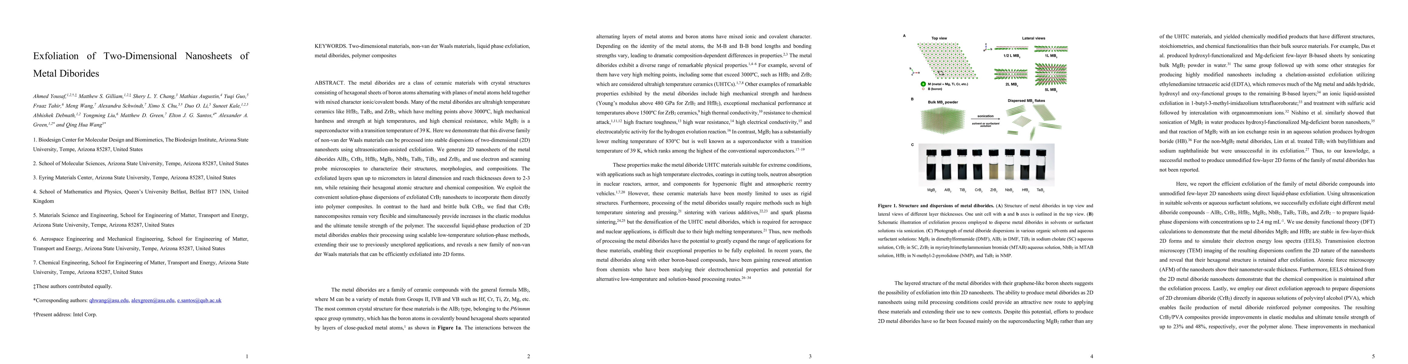 The metal diborides are a class of ceramic materials with crystal structures consisting of hexagonal sheets of boron atoms alternating with planes of metal atoms held together with mixed character ionic/covalent bonds. Many of the metal diborides are ultrahigh temperature ceramics like HfB$_2$, TaB$_2$, and ZrB$_2$, which have melting points above 3000$^\circ$C, high mechanical hardness and strength at high temperatures, and high chemical resistance, while MgB$_2$ is a superconductor with a transition temperature of 39 K. Here we demonstrate that this diverse family of non-van der Waals materials can be processed into stable dispersions of two-dimensional (2D) nanosheets using ultrasonication-assisted exfoliation. We generate 2D nanosheets of the metal diborides AlB$_2$, CrB$_2$, HfB$_2$, MgB$_2$, NbB$_2$, TaB$_2$, TiB$_2$, and ZrB$_2$, and use electron and scanning probe microscopies to characterize their structures, morphologies, and compositions. The exfoliated layers span up to micrometers in lateral dimension and reach thicknesses down to 2-3 nm, while retaining their hexagonal atomic structure and chemical composition. We exploit the convenient solution-phase dispersions of exfoliated CrB$_2$ nanosheets to incorporate them directly into polymer composites. In contrast to the hard and brittle bulk CrB$_2$, we find that CrB$_2$ nanocomposites remain very flexible and simultaneously provide increases in the elastic modulus and the ultimate tensile strength of the polymer. The successful liquid-phase production of 2D metal diborides enables their processing using scalable low-temperature solution-phase methods, extending their use to previously unexplored applications, and reveals a new family of non-van der Waals materials that can be efficiently exfoliated into 2D forms.