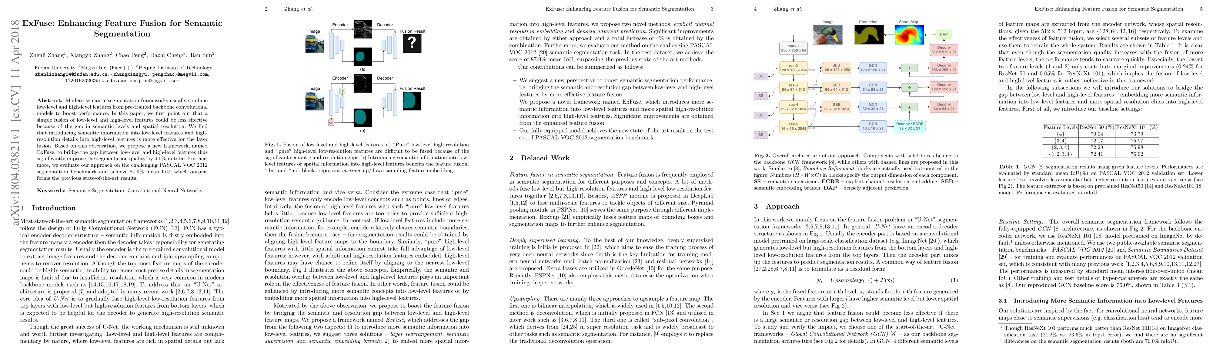 Researchers propose a new framework called ExFuse to improve semantic segmentation performance by bridging the gap between low-level and high-level features, achieving 87.9% mean IoU on the PASCAL VOC 2012 benchmark.