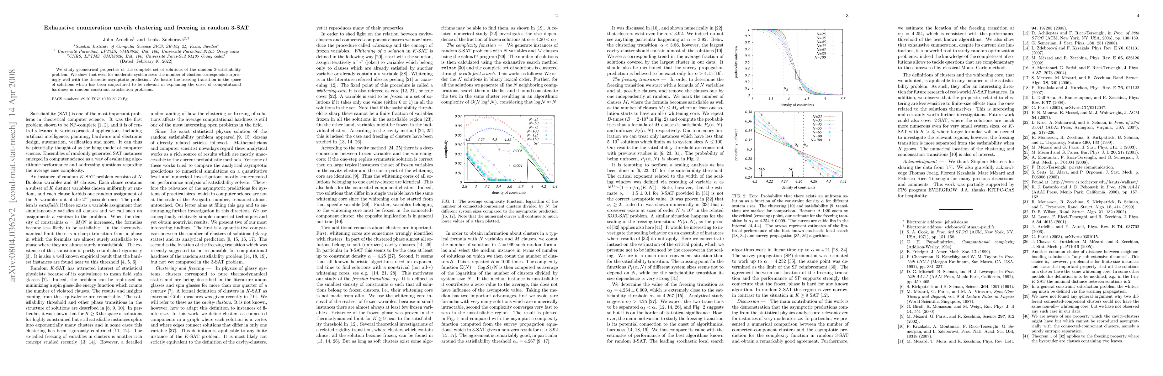 We study geometrical properties of the complete set of solutions of the random 3-satisfiability problem. We show that even for moderate system sizes the number of clusters corresponds surprisingly well with the theoretic asymptotic prediction. We locate the freezing transition in the space of solutions which has been conjectured to be relevant in explaining the onset of computational hardness in random constraint satisfaction problems.