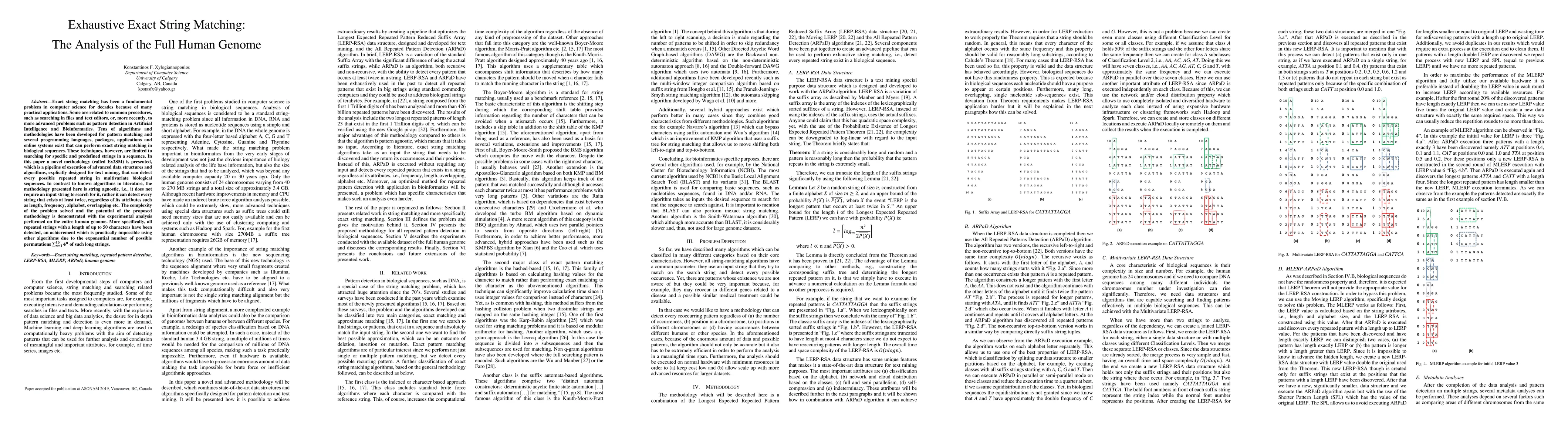 This paper introduces a novel methodology (Ex2SM) for exhaustive exact string matching in biological sequences, capable of detecting all repeated strings regardless of their attributes. The methodology is demonstrated through its application on the full human genome, successfully identifying all repeated strings up to 50 characters long, a feat unattainable by existing algorithms.