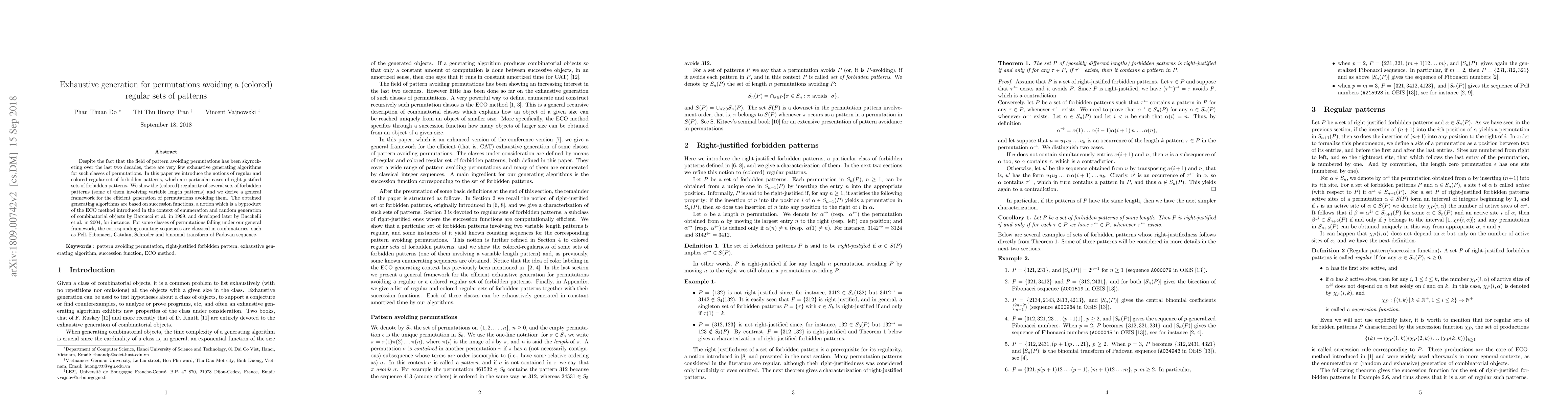 Despite the fact that the field of pattern avoiding permutations has been skyrocketing over the last two decades, there are very few exhaustive generating algorithms for such classes of permutations. In this paper we introduce the notions of regular and colored regular set of forbidden patterns, which are particular cases of right-justified sets of forbidden patterns. We show the (colored) regularity of several sets of forbidden patterns (some of them involving variable length patterns) and we derive a general framework for the efficient generation of permutations avoiding them. The obtained generating algorithms are based on succession functions, a notion which is a byproduct of the ECO method introduced in the context of enumeration and random generation of combinatorial objects by Barcucci et al. in 1999, and developed later by Bacchelli et al. in 2004, for instance. For some classes of permutations falling under our general framework, the corresponding counting sequences are classical in combinatorics, such as Pell, Fibonacci, Catalan, Schr\"oder and binomial transform of Padovan sequence.