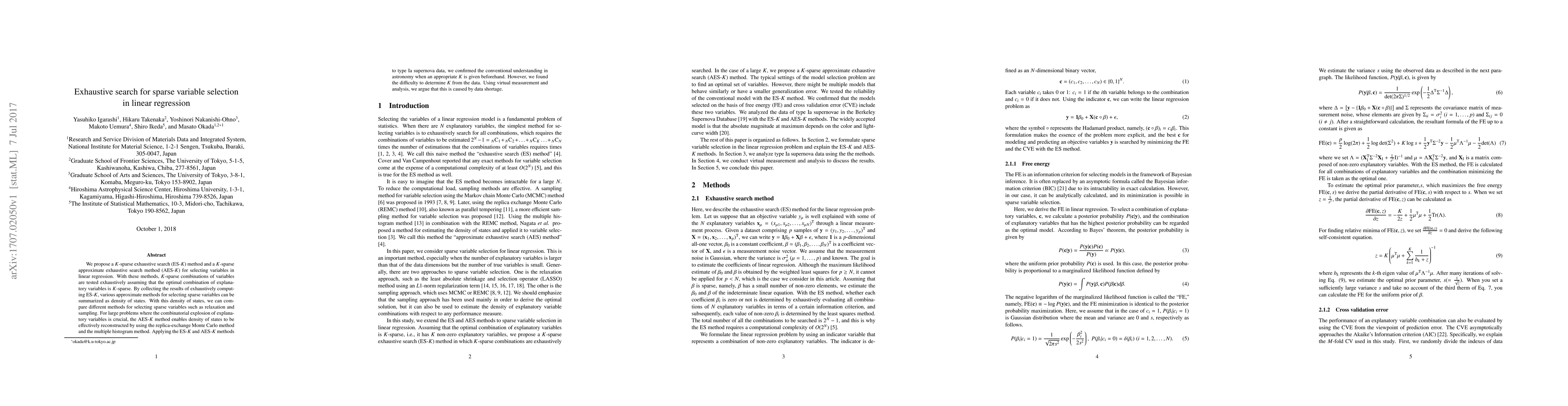 Researchers developed two methods to select sparse variables in linear regression: ES-K for exhaustive search and AES-K for approximate search. They found that the optimal K is difficult to determine from data due to data shortage.