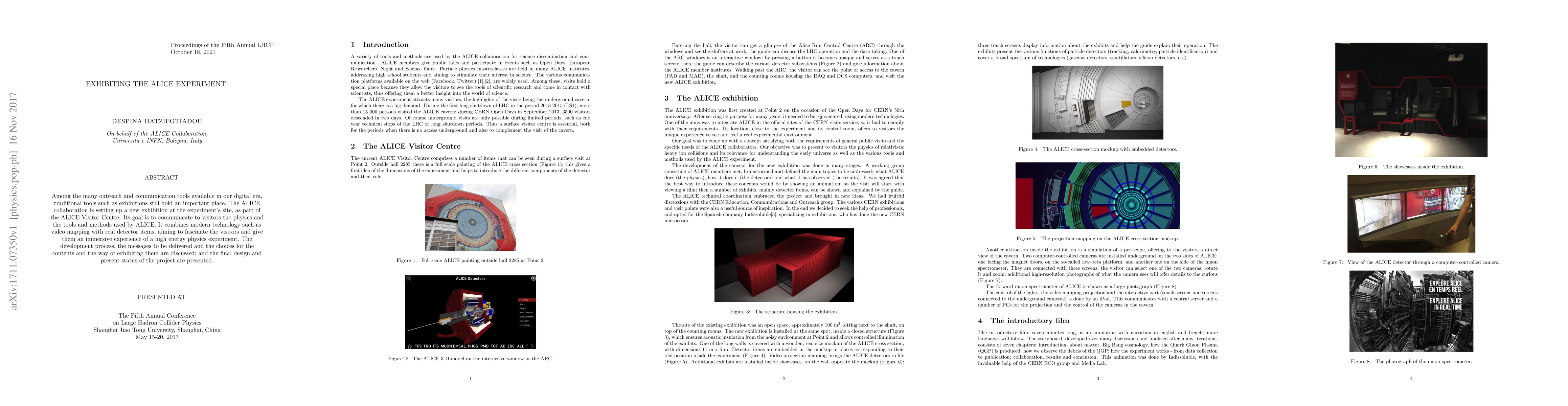 The ALICE collaboration is creating an immersive exhibition at its visitor center to communicate physics and experiment methods to visitors using modern technology like video mapping. The goal is to provide an engaging experience of high-energy physics experiments.