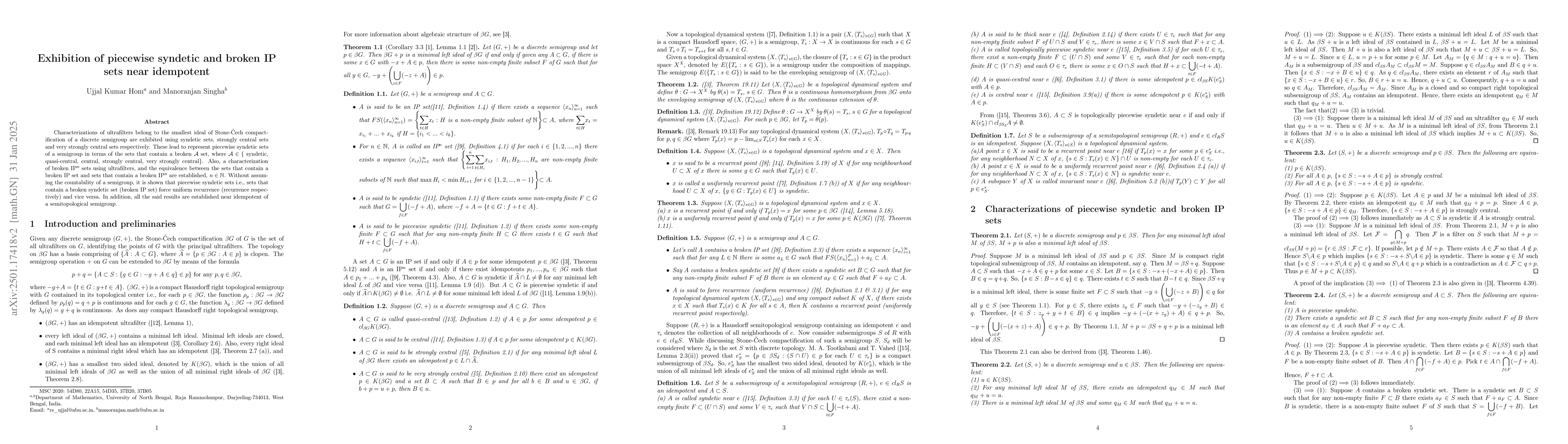 This paper characterizes ultrafilters in the Stone-\v{C}ech compactification of a discrete semigroup using various types of central sets, leading to the representation of piecewise syndetic sets in terms of broken sets. It establishes the equivalence between sets containing broken IP sets and those containing broken IP$^n$ sets, and shows that piecewise syndetic sets enforce uniform recurrence near idempotents in a semitopological semigroup.