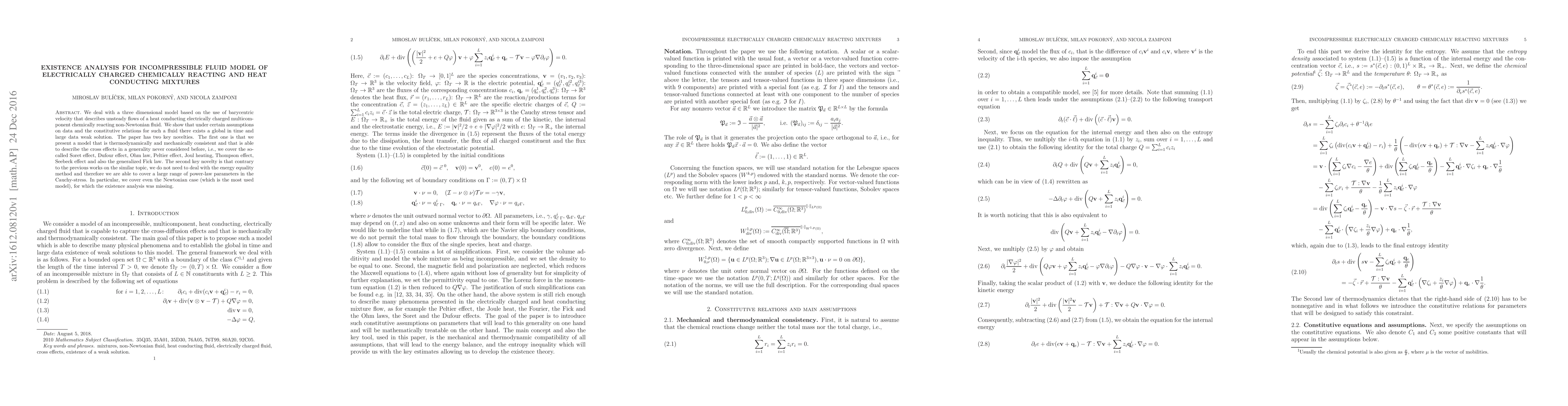 We deal with a three dimensional model based on the use of barycentric velocity that describes unsteady flows of a heat conducting electrically charged multicomponent chemically reacting non-Newtonian fluid. We show that under certain assumptions on data and the constitutive relations for such a fluid there exists a global in time and large data weak solution. The paper has two key novelties. The first one is that we present a model that is thermodynamically and mechanically consistent and that is able to describe the cross effects in a generality never considered before, i.e., we cover the so-called Soret effect, Dufour effect, Ohm law, Peltier effect, Joul heating, Thompson effect, Seebeck effect and also the generalized Fick law. The second key novelty is that contrary to the previous works on the similar topic, we do not need to deal with the energy equality method and therefore we are able to cover a large range of power-law parameters in the Cauchy-stress. In particular, we cover even the Newtonian case (which is the most used model), for which the existence analysis was missing.