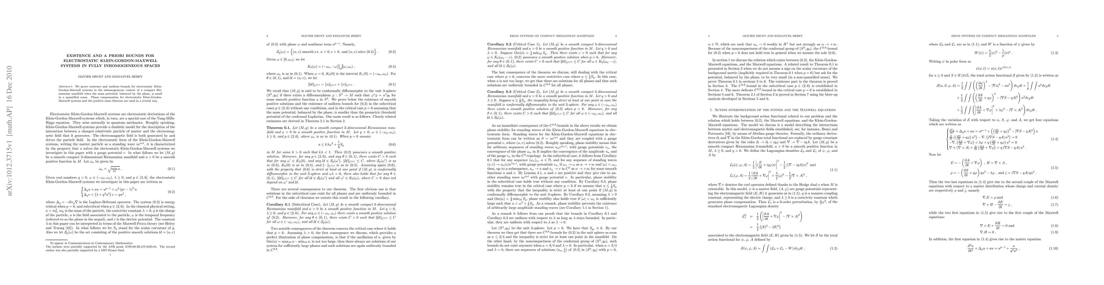 We prove existence and uniform bounds for electrostatic Klein-Gordon-Maxwell systems in the inhomogeneous context of a compact Riemannian manifold when the mass potential, balanced by the phase, is small in a quantified sense.