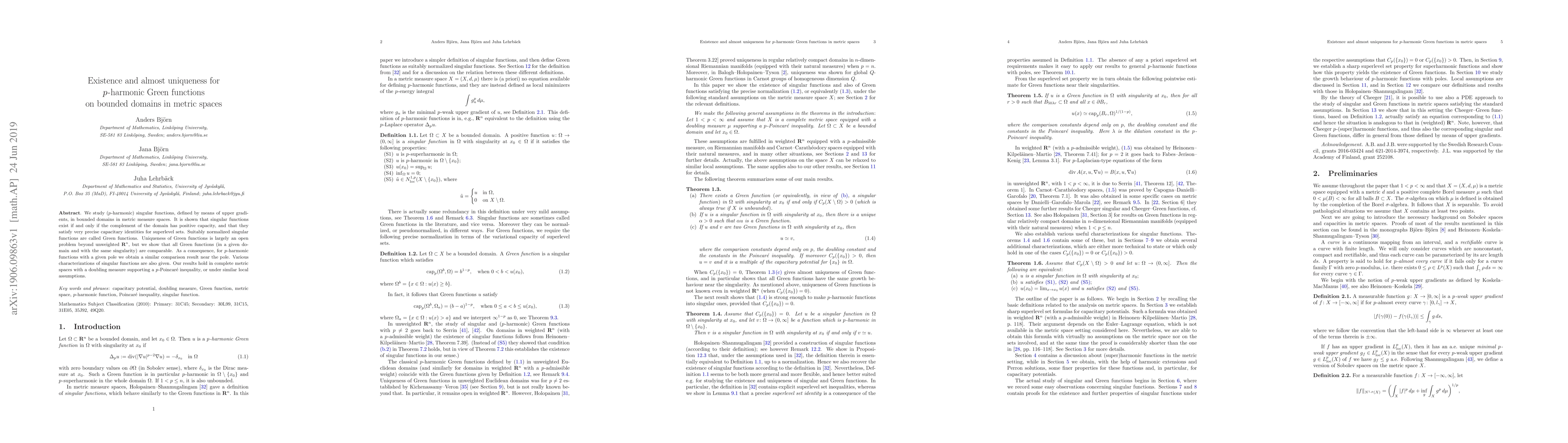 We study ($p$-harmonic) singular functions, defined by means of upper gradients, in bounded domains in metric measure spaces. It is shown that singular functions exist if and only if the complement of the domain has positive capacity, and that they satisfy very precise capacitary identities for superlevel sets. Suitably normalized singular functions are called Green functions. Uniqueness of Green functions is largely an open problem beyond unweighted $\mathbf{R}^n$, but we show that all Green functions (in a given domain and with the same singularity) are comparable. As a consequence, for $p$-harmonic functions with a given pole we obtain a similar comparison result near the pole. Various characterizations of singular functions are also given. Our results hold in complete metric spaces with a doubling measure supporting a $p$-Poincar\'e inequality, or under similar local assumptions.