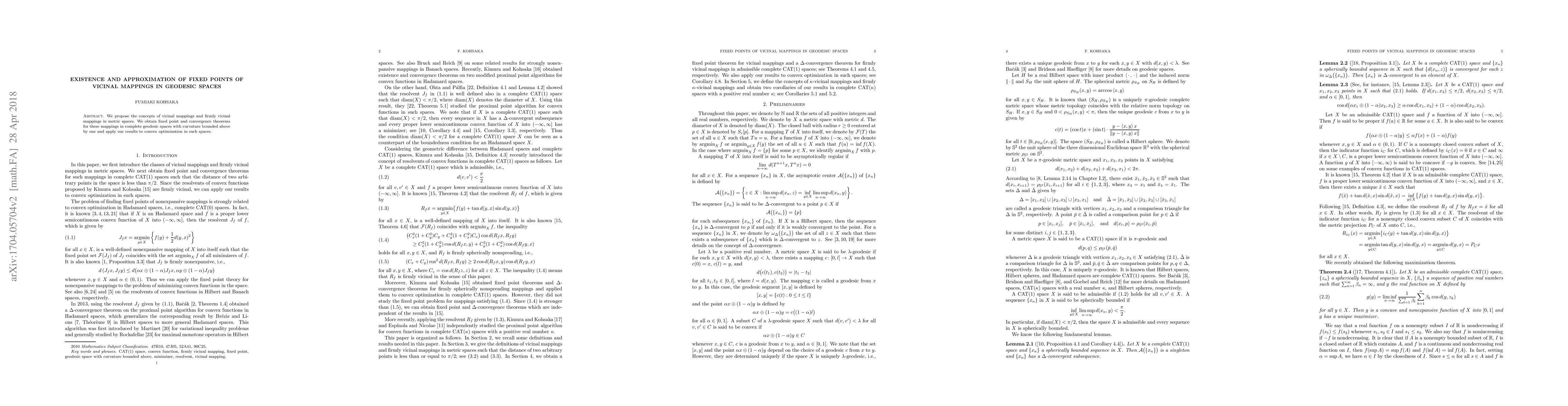 Summary: This paper introduces vicinal and firmly vicinal mappings in geodesic spaces, proving fixed point theorems and convergence results for these mappings in complete spaces with curvature constraints, and applying these findings to convex optimization problems.