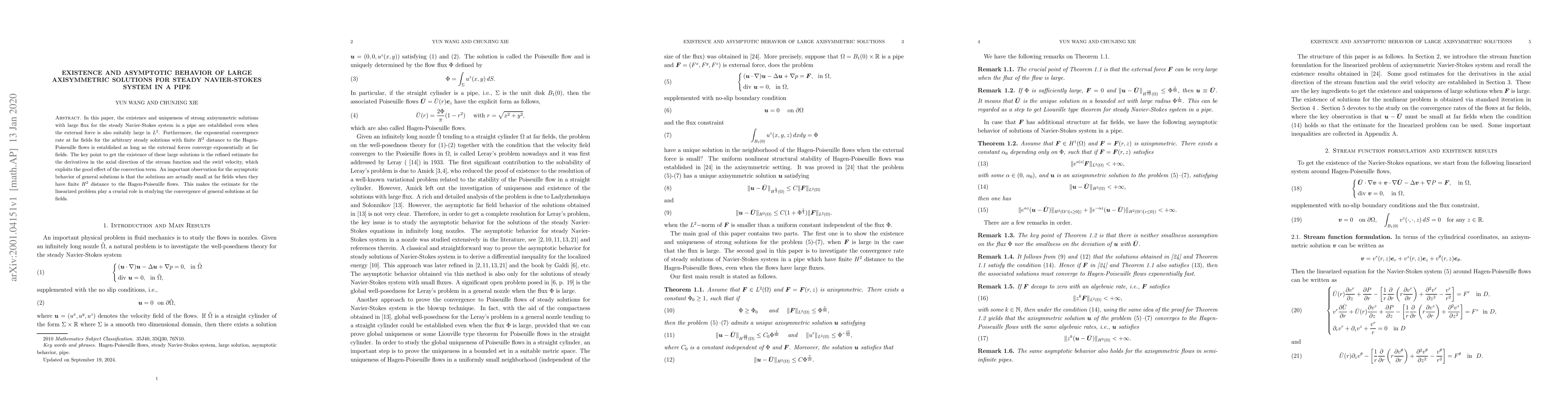 In this paper, the existence and uniqueness of strong axisymmetric solutions with large flux for the steady Navier-Stokes system in a pipe are established even when the external force is also suitably large in $L^2$. Furthermore, the exponential convergence rate at far fields for the arbitrary steady solutions with finite $H^2$ distance to the Hagen-Poiseuille flows is established as long as the external forces converge exponentially at far fields. The key point to get the existence of these large solutions is the refined estimate for the derivatives in the axial direction of the stream function and the swirl velocity, which exploits the good effect of the convection term. An important observation for the asymptotic behavior of general solutions is that the solutions are actually small at far fields when they have finite $H^2$ distance to the Hagen-Poiseuille flows. This makes the estimate for the linearized problem play a crucial role in studying the convergence of general solutions at far fields.