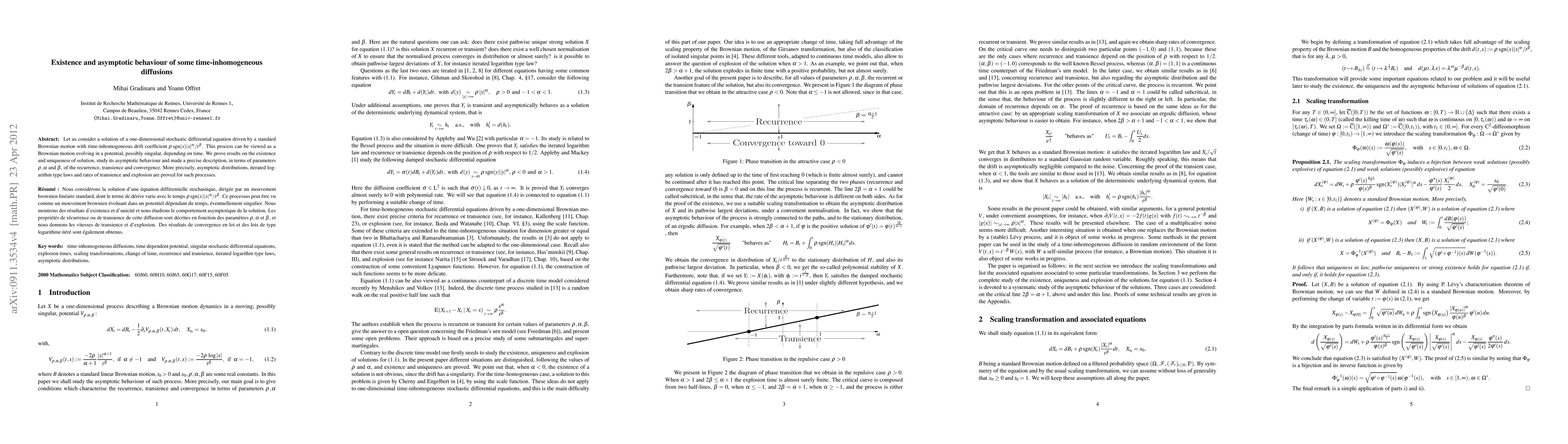 This research explores a specific type of time-varying diffusion processes, described by a stochastic differential equation with a drift coefficient dependent on time. It establishes the existence and uniqueness of solutions, then investigates their long-term behavior. Key findings include precise descriptions of recurrence, transience, and convergence, along with asymptotic distribution and rate of transience characteristics, all parameterized by $ ho$, $alpha$, and $eta$.