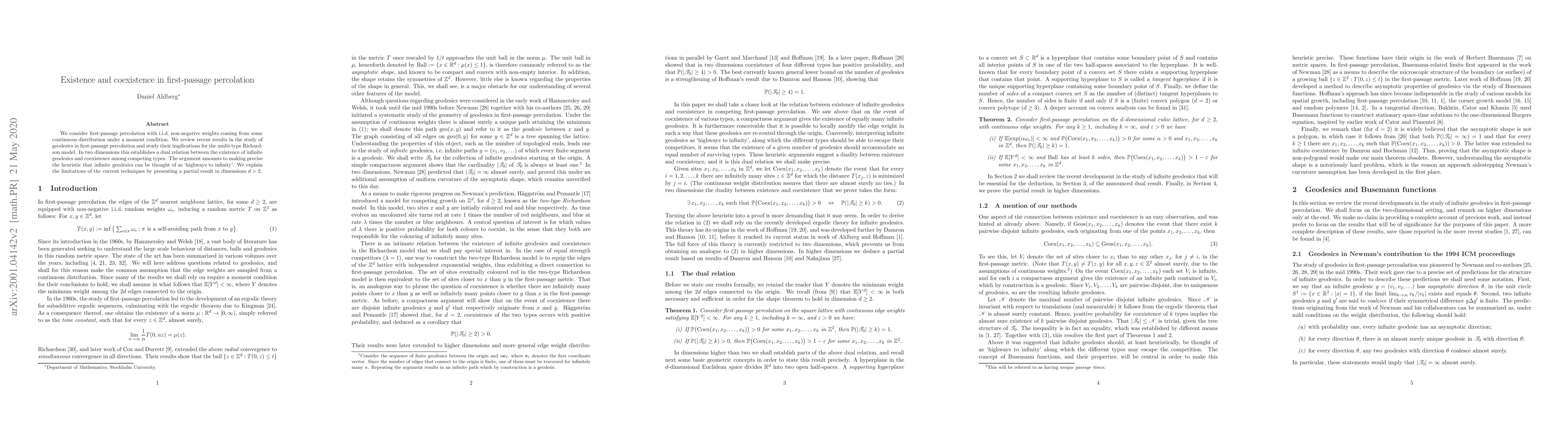This paper explores first-passage percolation with continuous weight distributions, establishing a dual relation in two dimensions between infinite geodesics and coexistence in the multi-type Richardson model, akin to 'highways to infinity'. It highlights limitations in extending these findings to higher dimensions.
